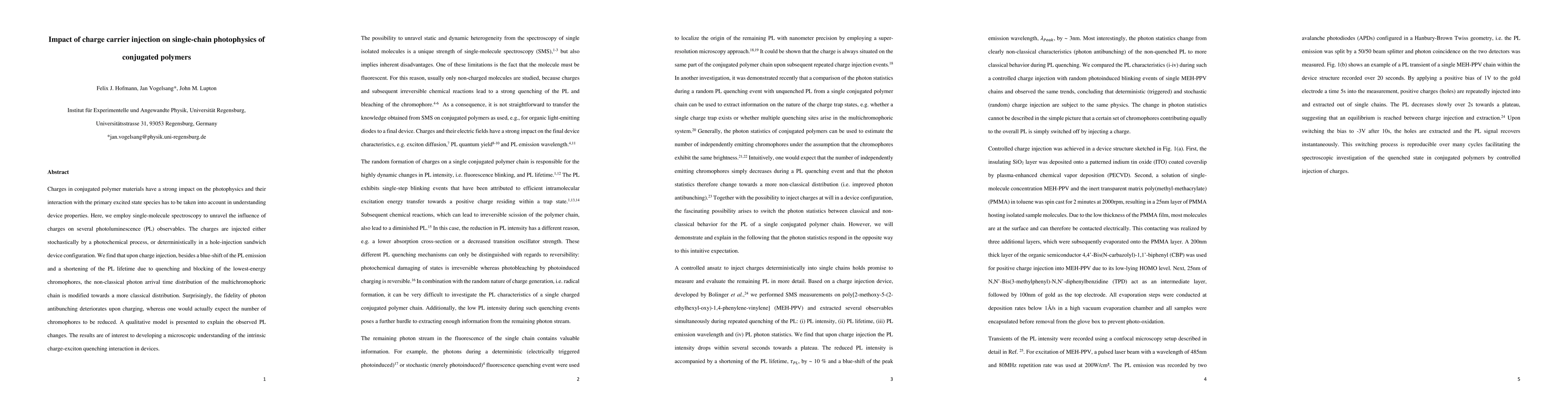 This paper investigates how charge carrier injection affects the photophysics of conjugated polymers using single-molecule spectroscopy. It finds that charge injection leads to a blue-shift in photoluminescence, shorter PL lifetimes, and changes in the photon arrival time distribution, which impacts the fidelity of photon antibunching.