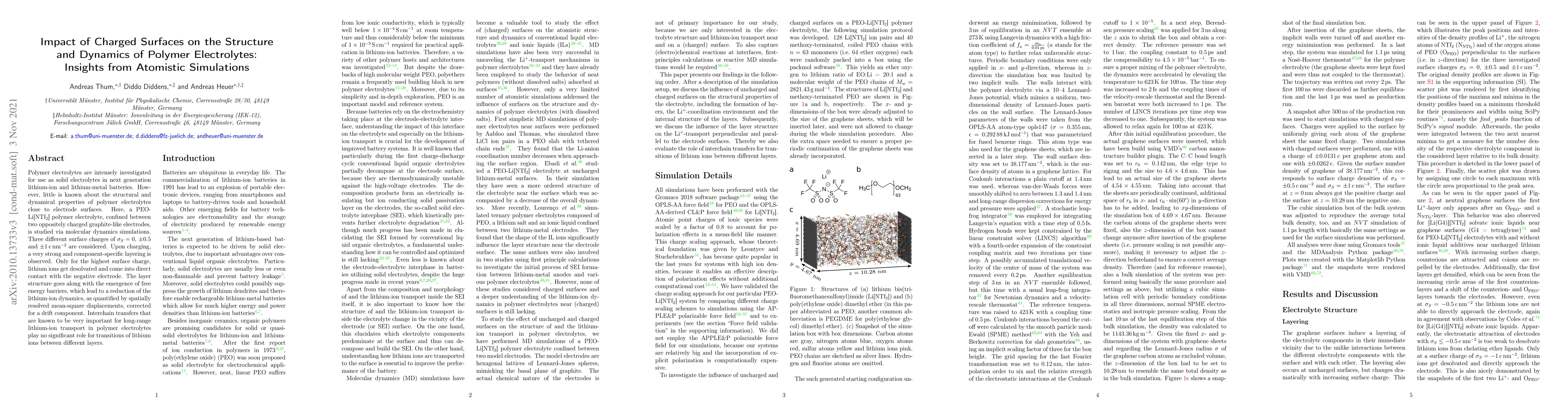 This study investigates the structural and dynamic behavior of PEO-LiTFSI polymer electrolytes near charged surfaces using molecular dynamics simulations. It finds that high surface charges induce strong, component-specific layering and reduce lithium-ion dynamics, while interchain transfers are not significant for ion movement between layers.