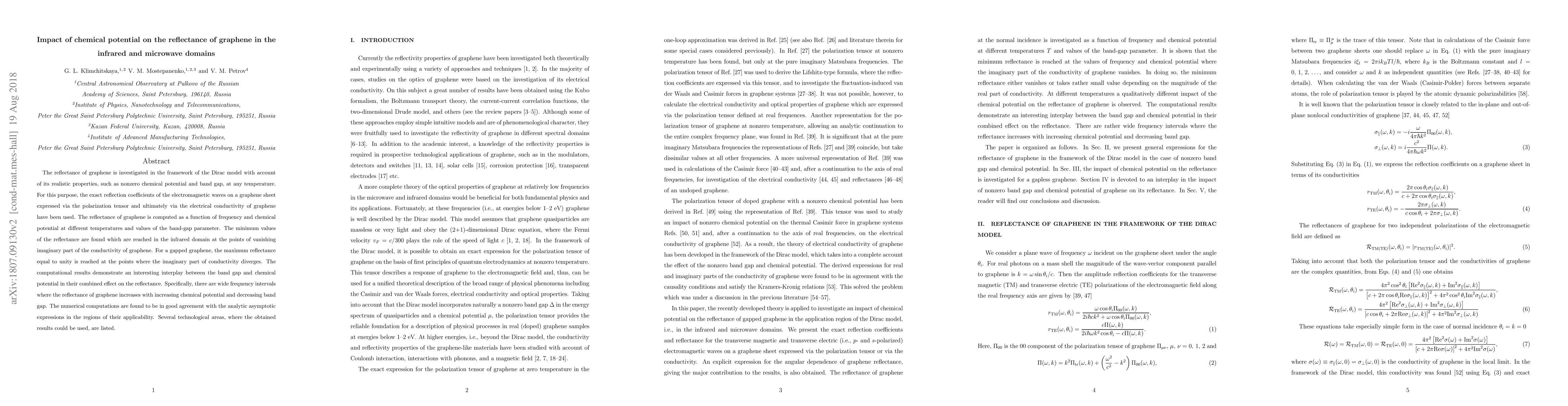 This study investigates graphene's reflectance in the infrared and microwave domains, finding that it depends on both chemical potential and band gap. The research reveals that the reflectance increases with higher chemical potential and lower band gap in specific frequency intervals.