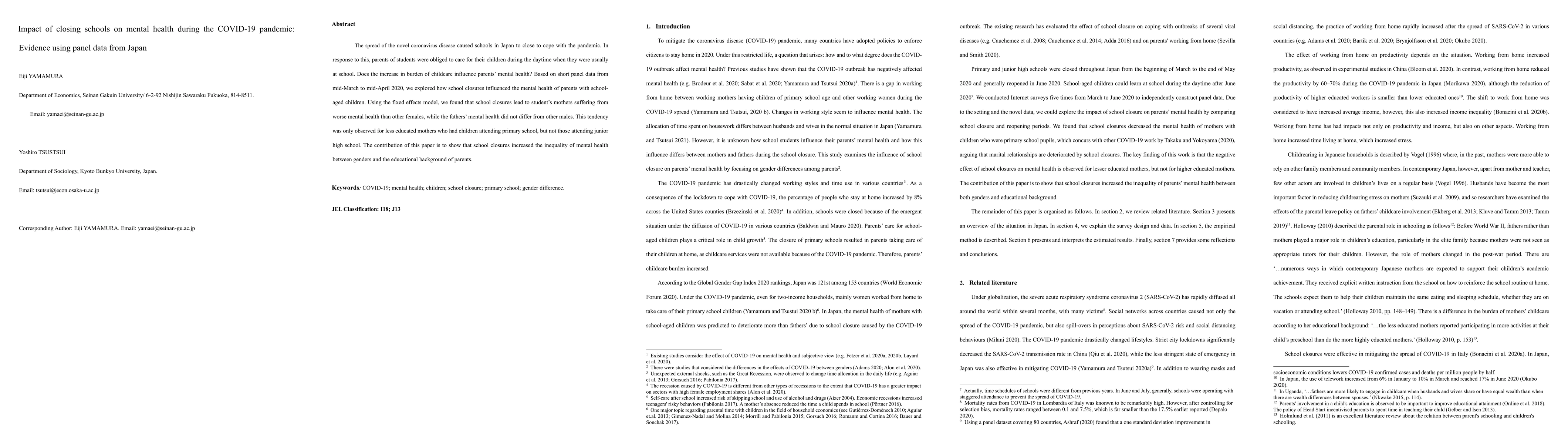The study finds that school closures during the COVID-19 pandemic in Japan worsened the mental health of less educated mothers with primary school-aged children, highlighting increased gender and educational inequality in mental health impacts. Fathers' mental health remained unaffected by the closures.