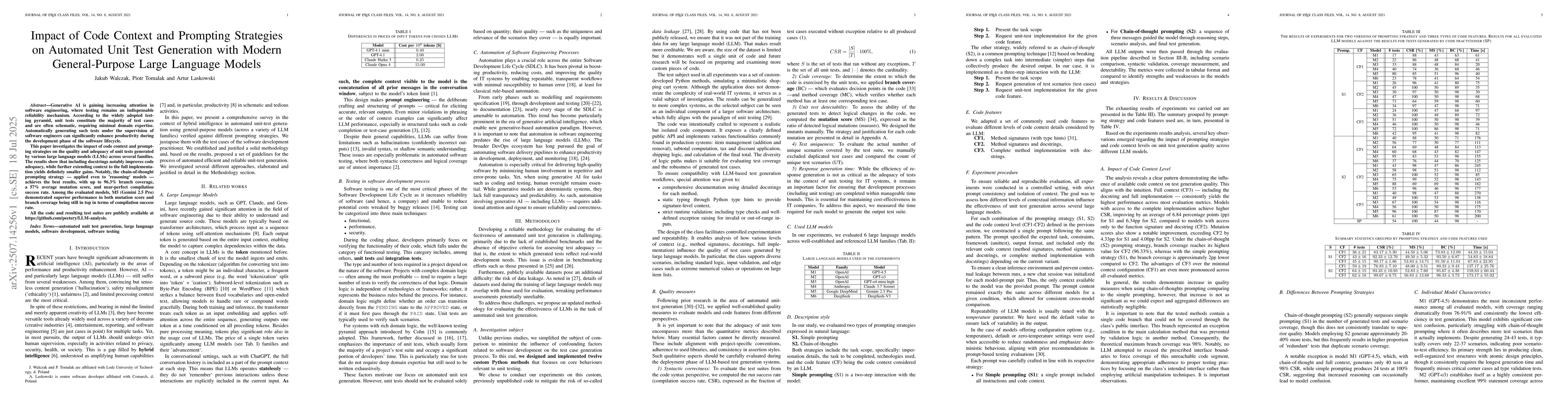 Generative AI is gaining increasing attention in software engineering, where testing remains an indispensable reliability mechanism. According to the widely adopted testing pyramid, unit tests constitute the majority of test cases and are often schematic, requiring minimal domain expertise. Automatically generating such tests under the supervision of software engineers can significantly enhance productivity during the development phase of the software lifecycle. This paper investigates the impact of code context and prompting strategies on the quality and adequacy of unit tests generated by various large language models (LLMs) across several families. The results show that including docstrings notably improves code adequacy, while further extending context to the full implementation yields definitely smaller gains. Notably, the chain-of-thought prompting strategy -- applied even to 'reasoning' models -- achieves the best results, with up to 96.3\% branch coverage, a 57\% average mutation score, and near-perfect compilation success rate. Among the evaluated models, M5 (Gemini 2.5 Pro) demonstrated superior performance in both mutation score and branch coverage being still in top in terms of compilation success rate. All the code and resulting test suites are publicly available at https://github.com/peetery/LLM-analysis.