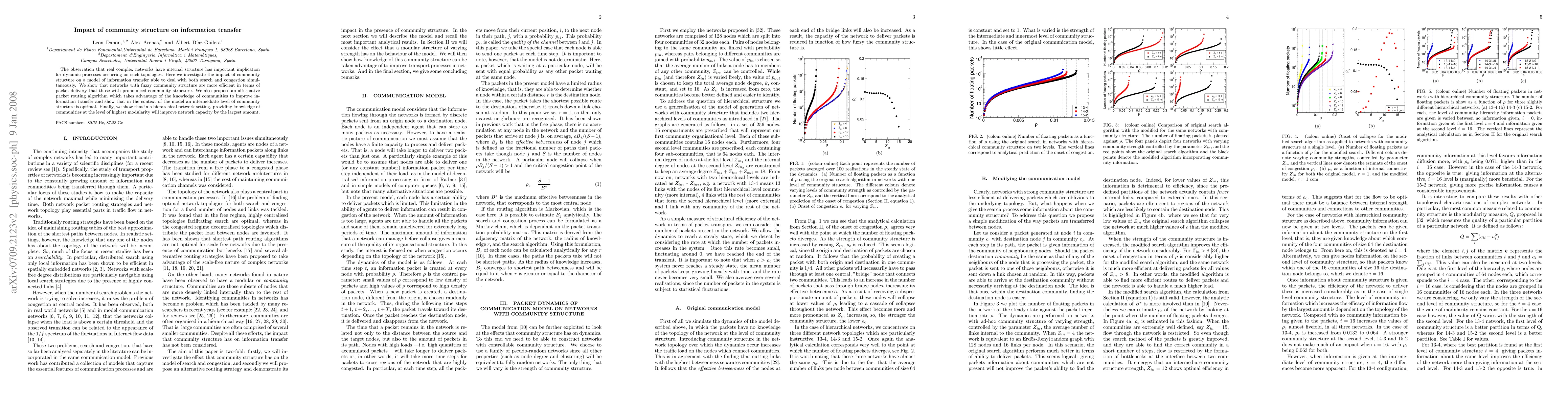 This paper examines how community structure in complex networks affects information transfer efficiency, demonstrating that networks with intermediate community structure are optimal for packet delivery. It also proposes an improved routing algorithm leveraging community knowledge to enhance transfer efficiency.