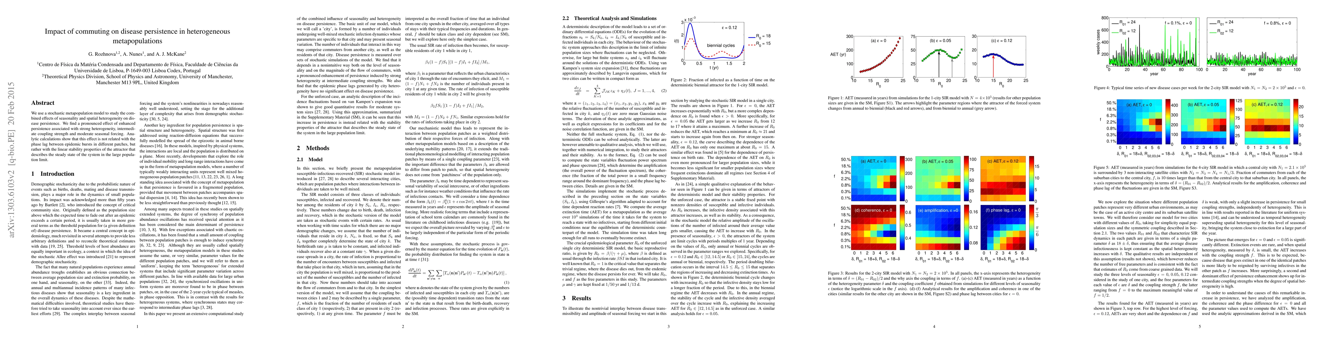 Summary: This study reveals that strong spatial heterogeneity, intermediate commuting rates, and moderate seasonal changes significantly enhance disease persistence in metapopulations, with persistence linked to the linear stability of the system's attractor rather than phase lags between epidemics.