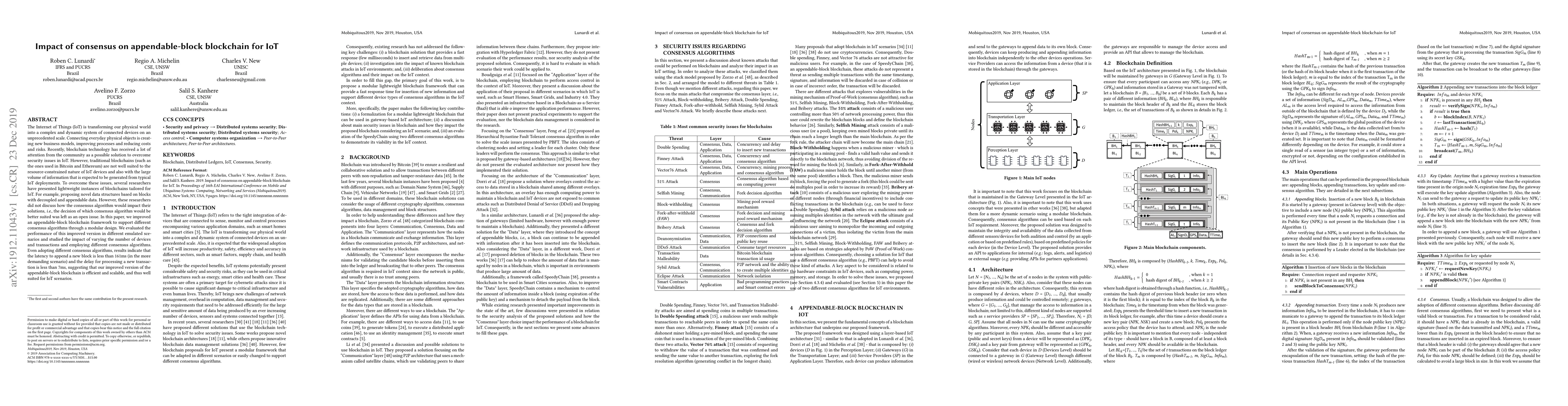 The Internet of Things (IoT) is transforming our physical world into a complex and dynamic system of connected devices on an unprecedented scale. Connecting everyday physical objects is creating new business models, improving processes and reducing costs and risks. Recently, blockchain technology has received a lot of attention from the community as a possible solution to overcome security issues in IoT. However, traditional blockchains (such as the ones used in Bitcoin and Ethereum) are not well suited to the resource-constrained nature of IoT devices and also with the large volume of information that is expected to be generated from typical IoT deployments. To overcome these issues, several researchers have presented lightweight instances of blockchains tailored for IoT. For example, proposing novel data structures based on blocks with decoupled and appendable data. However, these researchers did not discuss how the consensus algorithm would impact their solutions, i.e., the decision of which consensus algorithm would be better suited was left as an open issue. In this paper, we improved an appendable-block blockchain framework to support different consensus algorithms through a modular design. We evaluated the performance of this improved version in different emulated scenarios and studied the impact of varying the number of devices and transactions and employing different consensus algorithms. Even adopting different consensus algorithms, results indicate that the latency to append a new block is less than 161ms (in the more demanding scenario) and the delay for processing a new transaction is less than 7ms, suggesting that our improved version of the appendable-block blockchain is efficient and scalable, and thus well suited for IoT scenarios.
