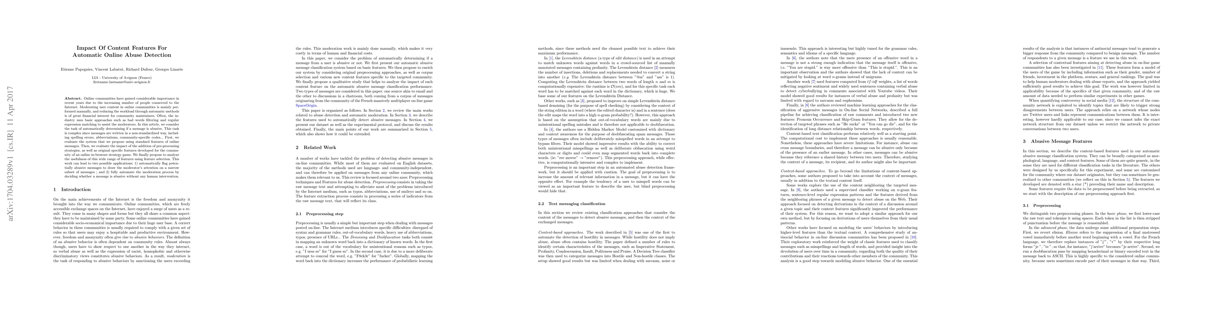 Online communities have gained considerable importance in recent years due to the increasing number of people connected to the Internet. Moderating user content in online communities is mainly performed manually, and reducing the workload through automatic methods is of great financial interest for community maintainers. Often, the industry uses basic approaches such as bad words filtering and regular expression matching to assist the moderators. In this article, we consider the task of automatically determining if a message is abusive. This task is complex since messages are written in a non-standardized way, including spelling errors, abbreviations, community-specific codes... First, we evaluate the system that we propose using standard features of online messages. Then, we evaluate the impact of the addition of pre-processing strategies, as well as original specific features developed for the community of an online in-browser strategy game. We finally propose to analyze the usefulness of this wide range of features using feature selection. This work can lead to two possible applications: 1) automatically flag potentially abusive messages to draw the moderator's attention on a narrow subset of messages ; and 2) fully automate the moderation process by deciding whether a message is abusive without any human intervention.