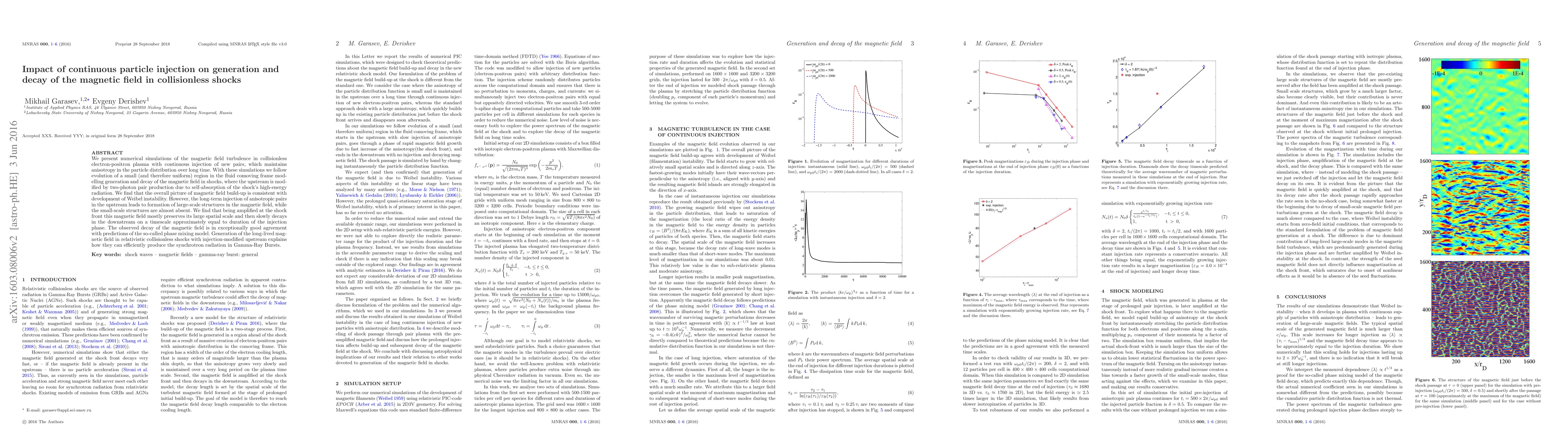 This paper uses numerical simulations to study the impact of continuous particle injection on magnetic field generation and decay in collisionless shocks, finding that the injection leads to large-scale magnetic structures while small-scale structures are absent, and that the magnetic field's decay aligns well with the phase mixing model, explaining efficient synchrotron radiation production in Gamma-Ray Bursts.