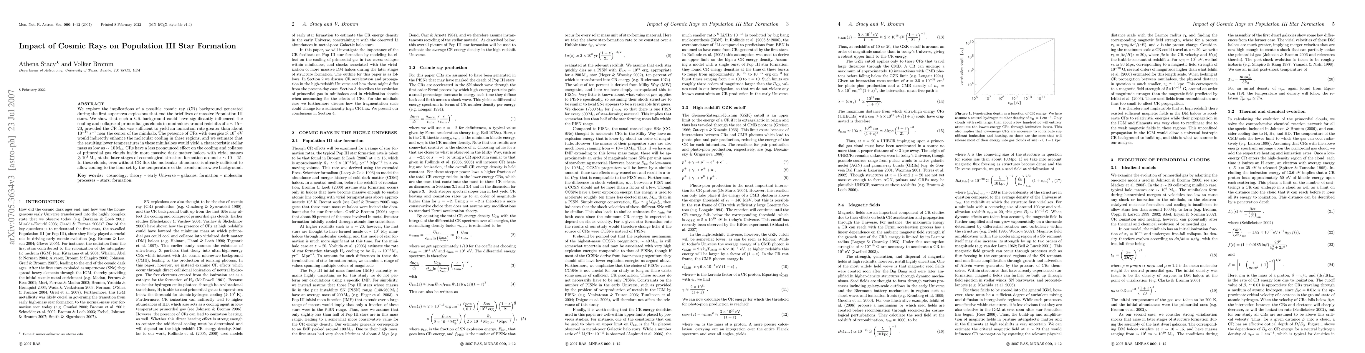 The paper presents a detailed analysis of CR effects on primordial gas clouds, including CR ionization and heating rates, and their implications for star formation in minihaloes and higher-mass haloes.
