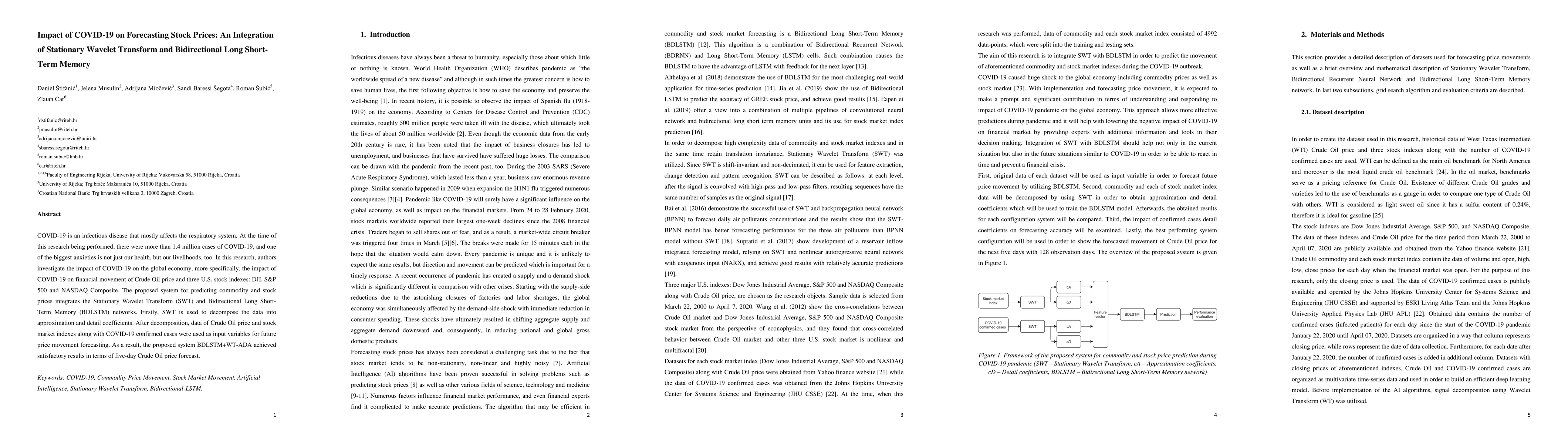 COVID-19 is an infectious disease that mostly affects the respiratory system. At the time of this research being performed, there were more than 1.4 million cases of COVID-19, and one of the biggest anxieties is not just our health, but our livelihoods, too. In this research, authors investigate the impact of COVID-19 on the global economy, more specifically, the impact of COVID-19 on financial movement of Crude Oil price and three U.S. stock indexes: DJI, S&P 500 and NASDAQ Composite. The proposed system for predicting commodity and stock prices integrates the Stationary Wavelet Transform (SWT) and Bidirectional Long Short-Term Memory (BDLSTM) networks. Firstly, SWT is used to decompose the data into approximation and detail coefficients. After decomposition, data of Crude Oil price and stock market indexes along with COVID-19 confirmed cases were used as input variables for future price movement forecasting. As a result, the proposed system BDLSTM+WT-ADA achieved satisfactory results in terms of five-day Crude Oil price forecast.