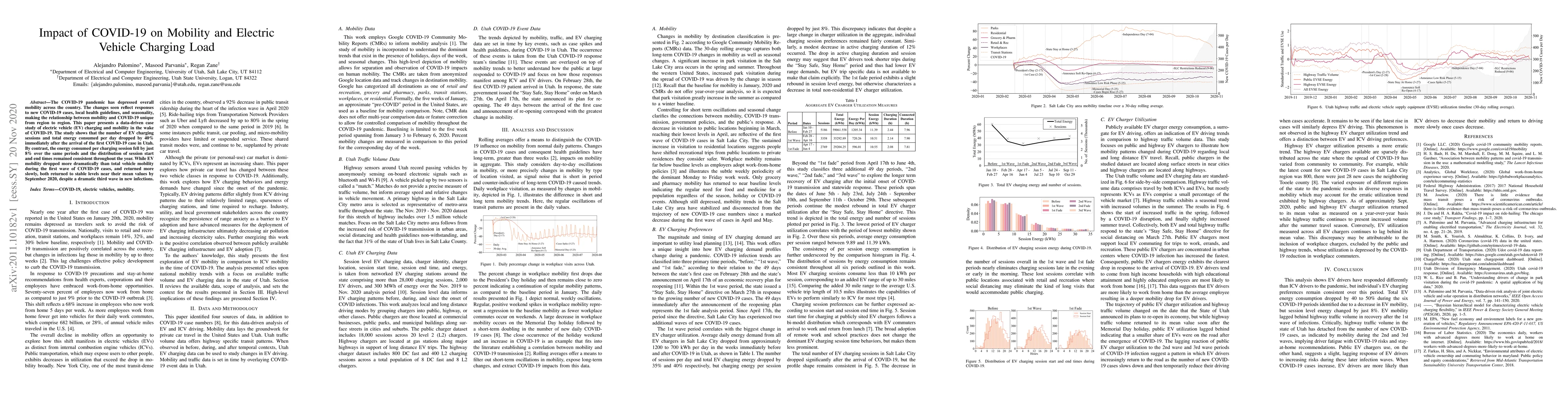 This study examines the impact of COVID-19 on electric vehicle (EV) charging and mobility in Utah, finding a 40% drop in EV charging sessions and energy consumption immediately after the first case, while energy per session decreased by only 8%. Despite a third wave of infections, EV mobility and charging patterns returned to pre-pandemic levels by September 2020.