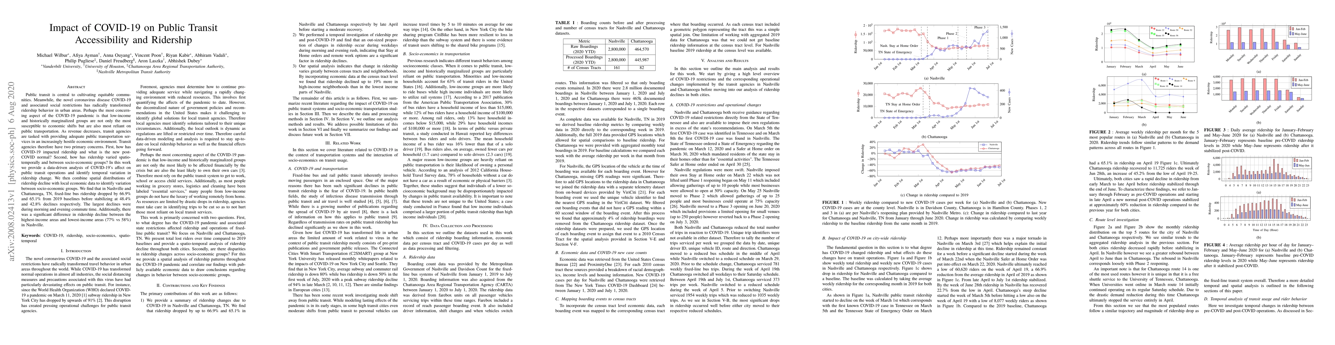 This study analyzes the impact of COVID-19 on public transit accessibility and ridership, focusing on Nashville and Chattanooga, TN. It reveals significant declines in fixed-line bus ridership, with morning and evening commute times experiencing the largest drops, and socio-economic disparities in ridership reductions.