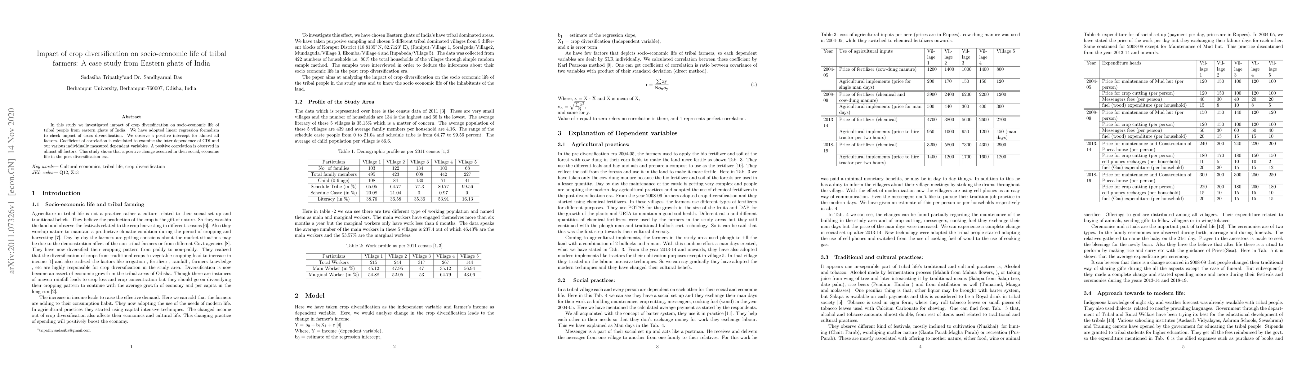 This study examines the socio-economic impact of crop diversification on tribal farmers in the Eastern Ghats of India, finding a positive correlation between diversification and improved social and economic conditions through linear regression and correlation analysis. The results indicate significant positive changes in the farmers' lives post-diversification.