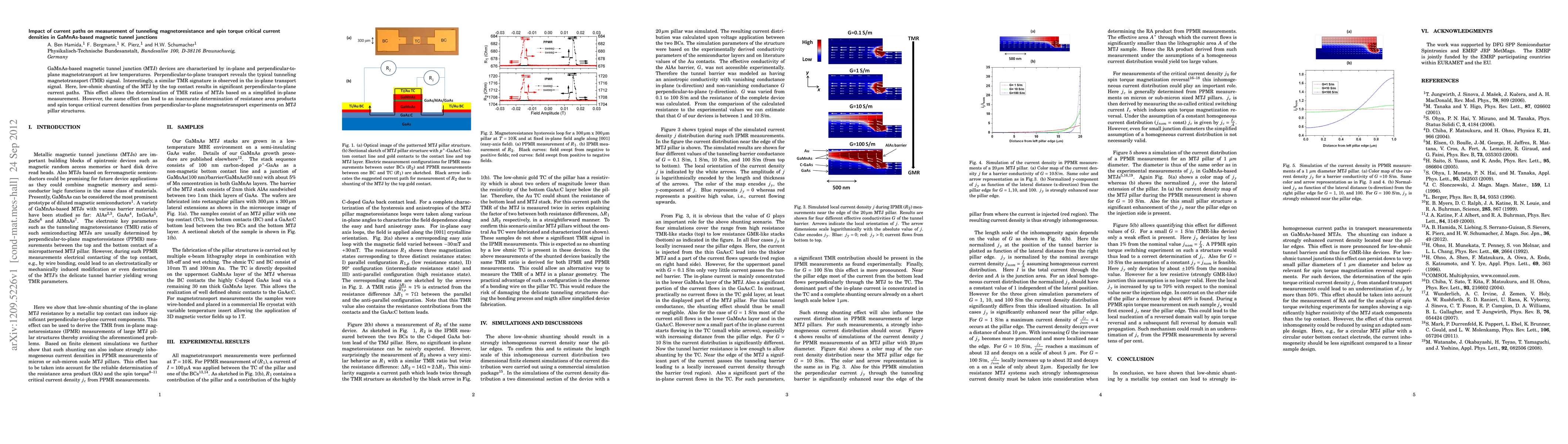 GaMnAs-based magnetic tunnel junction (MTJ) devices are characterized by in-plane and perpendicular-toplane magnetotransport at low temperatures. Perpendicular-to-plane transport reveals the typical tunneling magnetotransport (TMR) signal. Interestingly, a similar TMR signature is observed in the in-plane transport signal. Here, low-ohmic shunting of the MTJ by the top contact results in significant perpendicular-to-plane current paths. This effect allows the determination of TMR ratios of MTJs based on a simplified in-plane measurement. However, the same effect can lead to an inaccurate determination of resistance area products and spin torque critical current densities from perpendicular-to-plane magnetotransport experiments on MTJ pillar structures.