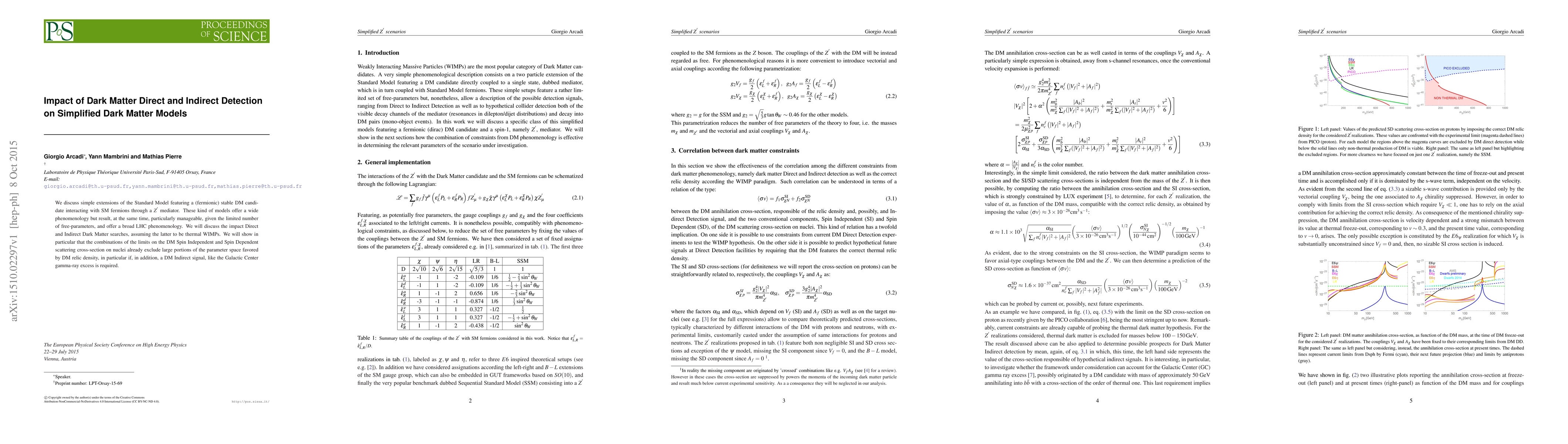 We discuss simple extensions of the Standard Model featuring a (fermionic) stable DM candidate interacting with SM fermions through a $Z^{'}$ mediator. These kind of models offer a wide phenomenology but result, at the same time, particularly manageable, given the limited number of free-parameters, and offer a broad LHC phenomenology. We will discuss the impact Direct and Indirect Dark Matter searches, assuming the latter to be thermal WIMPs. We will show in particular that the combinations of the limits on the DM Spin Independent and Spin Dependent scattering cross-section on nuclei already exclude large portions of the parameter space favored by DM relic density, in particular if, in addition, a DM Indirect signal, like the Galactic Center gamma-ray excess is required.