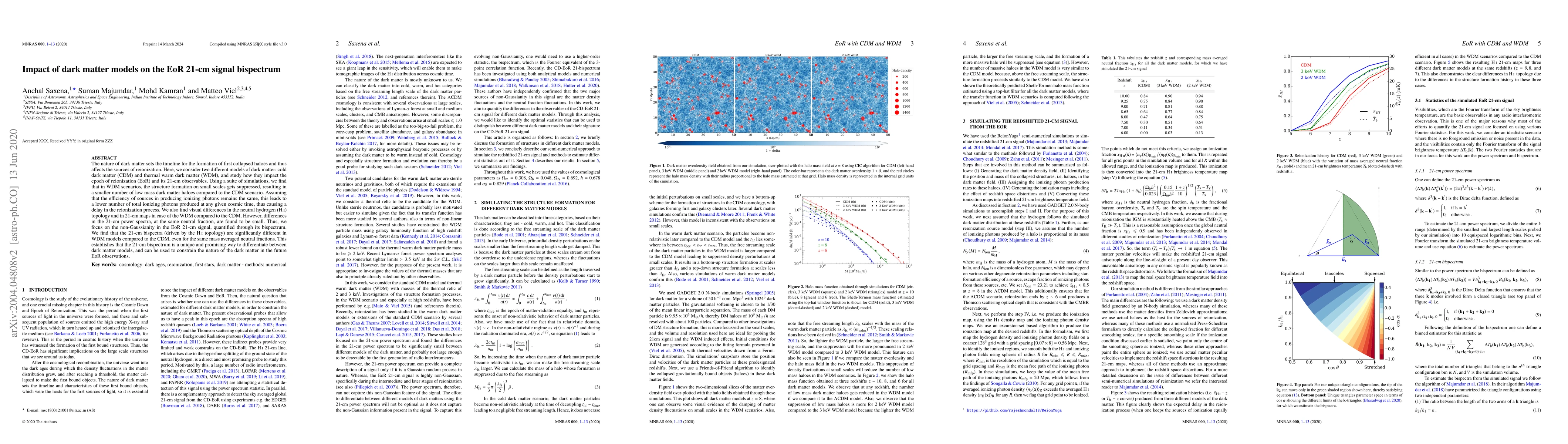 This paper investigates how cold dark matter (CDM) and thermal warm dark matter (WDM) models impact the epoch of reionization (EoR) and its 21-cm signal bispectrum. It finds that WDM suppresses small-scale structure formation, delaying reionization and altering neutral hydrogen topology, with significant differences in the 21-cm bispectrum compared to CDM, suggesting it can distinguish between dark matter models.