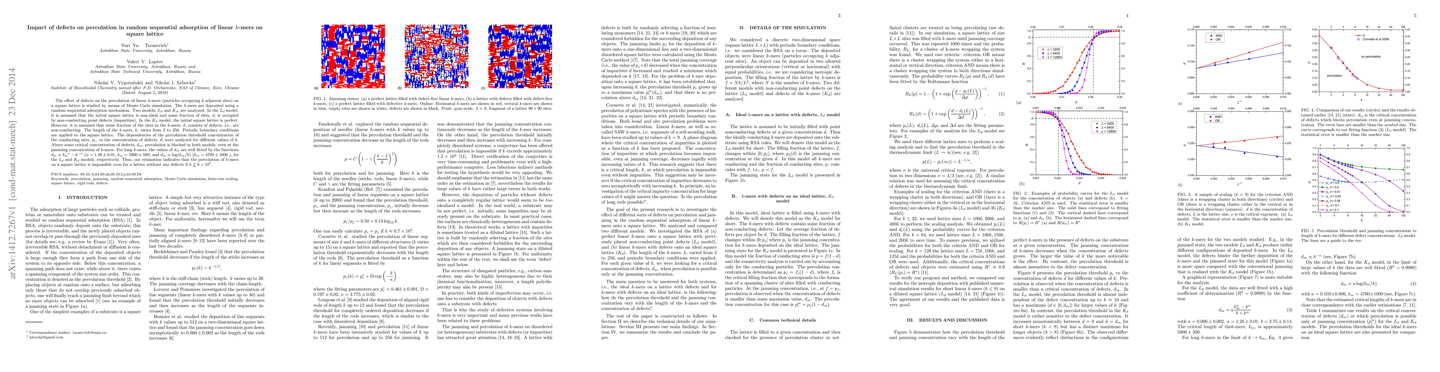 The effect of defects on the percolation of linear $k$-mers (particles occupying $k$ adjacent sites) on a square lattice is studied by means of Monte Carlo simulation. The $k$-mers are deposited using a random sequential adsorption mechanism. Two models, $L_d$ and $K_d$, are analyzed. In the $L_d$ model, it is assumed that the initial square lattice is non-ideal and some fraction of sites, $d$, is occupied by non-conducting point defects (impurities). In the $K_d$ model, the initial square lattice is perfect. However, it is assumed that some fraction of the sites in the $k$-mers, $d$, consists of defects, i.e., are non-conducting. The length of the $k$-mers, $k$, varies from 2 to 256. Periodic boundary conditions are applied to the square lattice. The dependencies of the percolation threshold concentration of the conducting sites, $p_c$, vs the concentration of defects, $d$, were analyzed for different values of $k$. Above some critical concentration of defects, $d_m$, percolation is blocked in both models, even at the jamming concentration of $k$-mers. For long $k$-mers, the values of $d_m$ are well fitted by the functions $d_m \propto k_m^{-\alpha}-k^{-\alpha}$ ($\alpha = 1.28 \pm 0.01$, $k_m = 5900 \pm 500$) and $d_m \propto \log (k_m/k)$ ($k_m = 4700 \pm 1000$ ), for the $L_d$ and $K_d$ models, respectively. Thus, our estimation indicates that the percolation of $k$-mers on a square lattice is impossible even for a lattice without any defects if $k\gtrapprox 6 \times 10^3$.