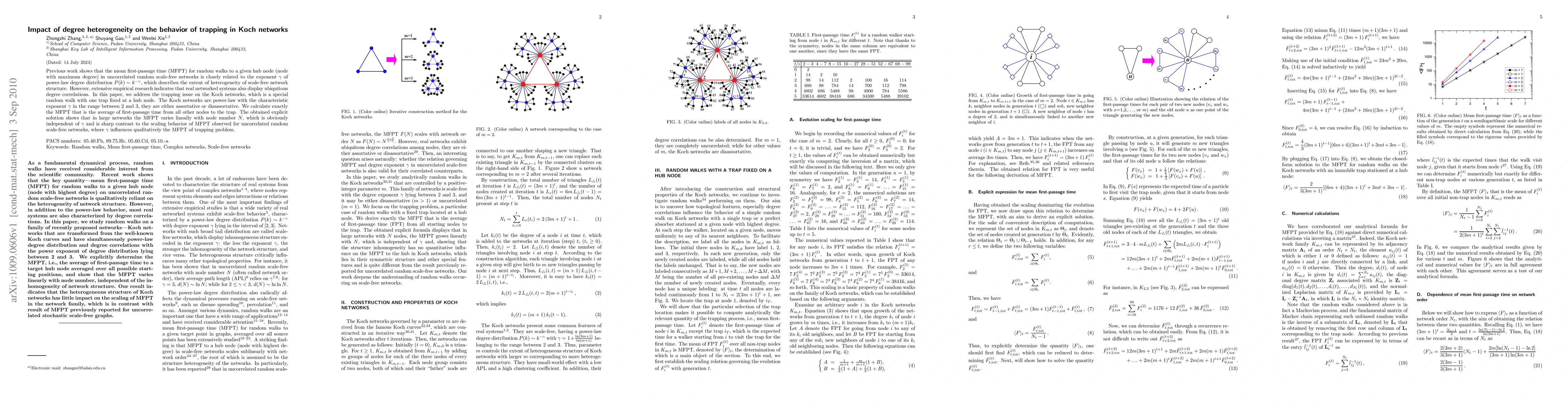 This paper investigates the trapping behavior in Koch networks, revealing that the mean first-passage time (MFPT) to a fixed trap at a hub node scales linearly with network size $N$, regardless of the degree heterogeneity exponent $\gamma$. This contrasts with the scaling behavior in uncorrelated random scale-free networks where $\gamma$ significantly influences MFPT.