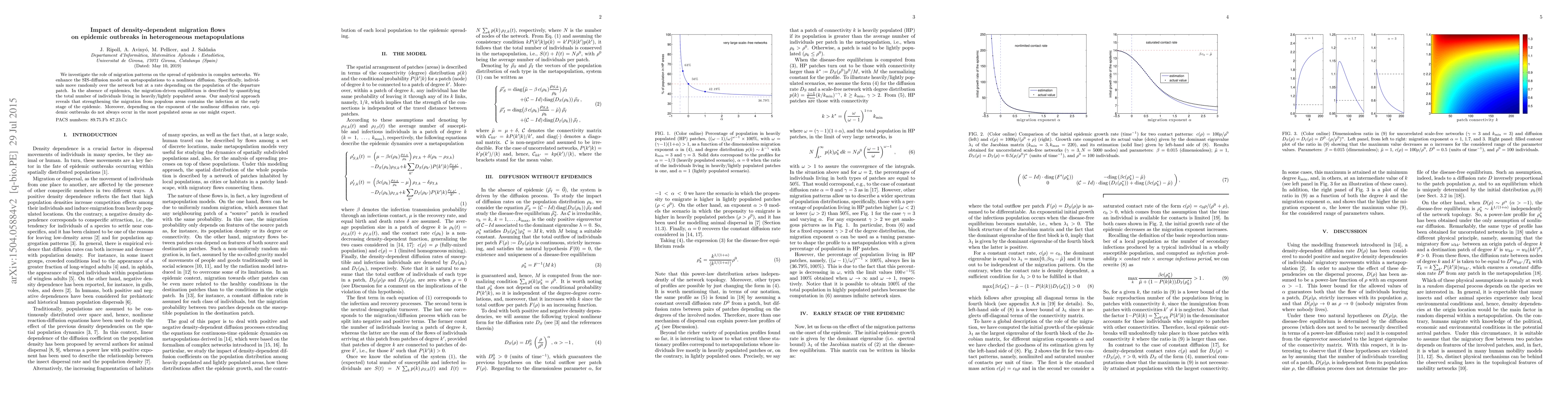 This study explores how density-dependent migration affects epidemic outbreaks in heterogeneous metapopulations, enhancing the SIS-diffusion model to account for nonlinear diffusion. The findings suggest that migration from populous areas can contain infections early, but the likelihood of outbreaks depends on the nonlinear diffusion rate, defying the assumption that outbreaks occur in the most populated areas.