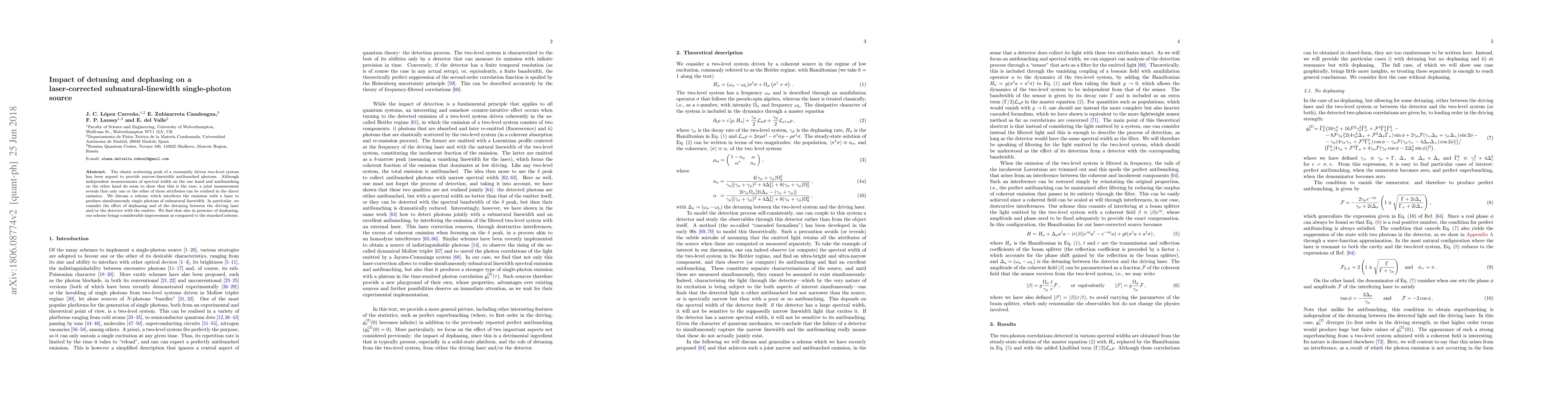 This paper investigates how detuning and dephasing affect a laser-corrected subnatural-linewidth single-photon source, revealing that simultaneous realization of narrow linewidth and antibunching is not possible in direct emission. The proposed scheme using laser interference achieves both subnatural linewidth and single-photon emission, even in the presence of dephasing.