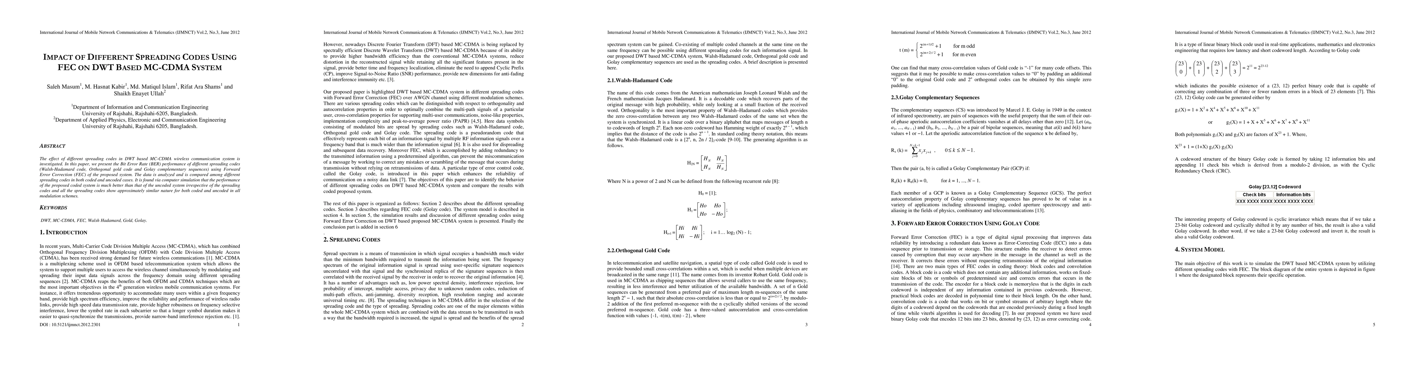 This paper investigates the impact of various spreading codes (Walsh-Hadamard, Gold, and Golay) on the performance of a DWT based MC-CDMA system with FEC. The study finds that the proposed coded system significantly outperforms the uncoded system, with all spreading codes showing similar performance in both scenarios.