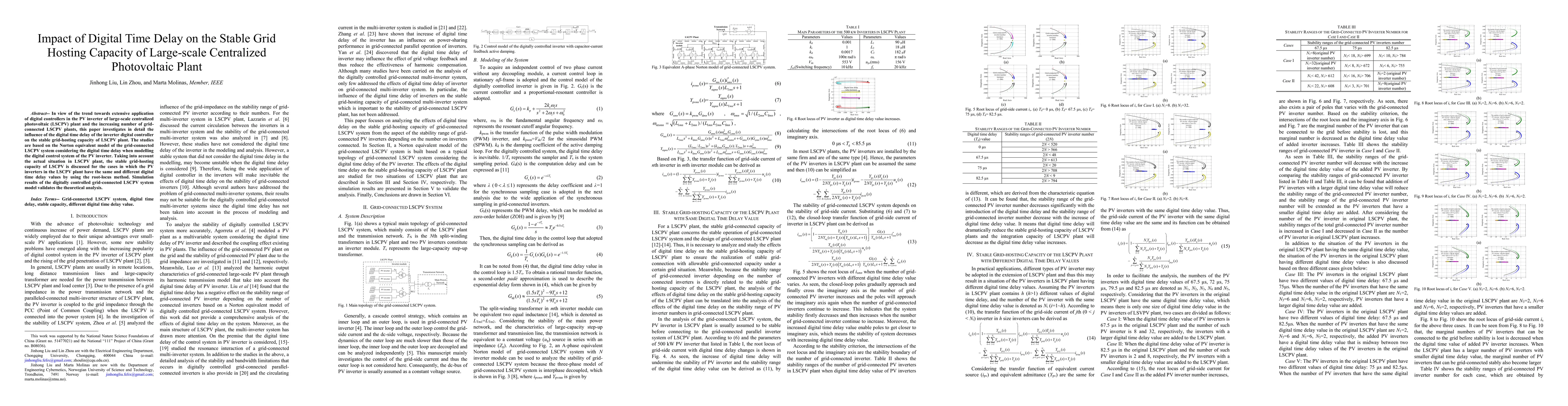 In view of the trend towards extensive application of digital controllers in the PV inverter of large-scale centralized photovoltaic (LSCPV) plant and the increasing number of grid-connected LSCPV plants, this paper investigates in detail the influence of the digital time delay of the inverter digital controller on the stable grid-hosting capacity of LSCPV plant. The studies are based on the Norton equivalent model of the grid-connected LSCPV system considering the digital time delay when modelling the digital control system of the PV inverter. Taking into account the actual situation in LSCPV plant, the stable grid-hosting capacity of LSCPV is discussed for the cases in which the PV inverters in the LSCPV plant have the same and different digital time delay values by using the root-locus method. Simulation results of the digitally controlled grid-connected LSCPV system model validates the theoretical analysis.