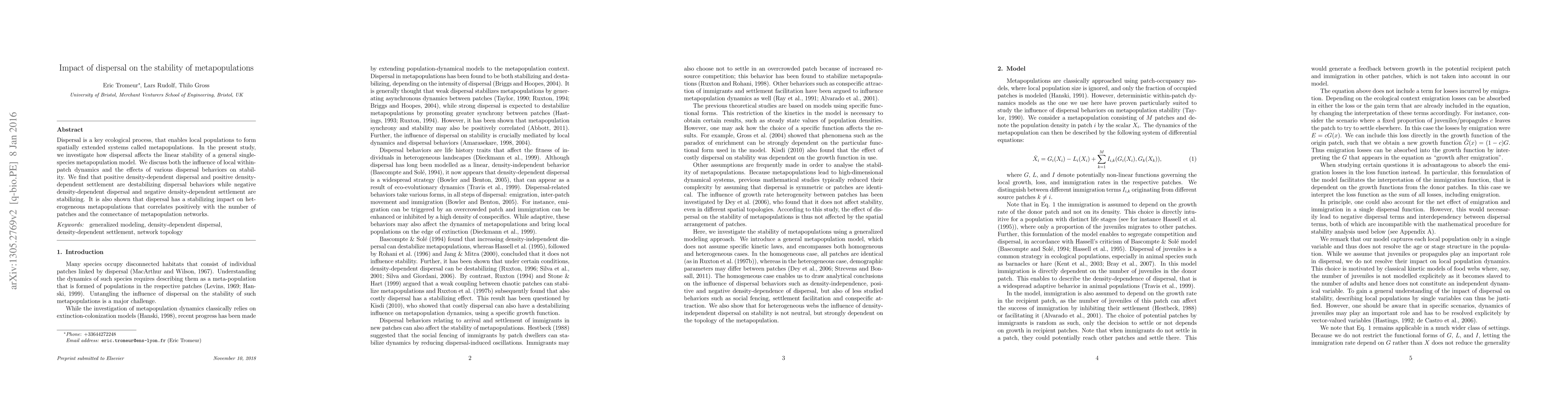 Dispersal behaviors can either destabilize or stabilize metapopulations, depending on whether they are density-dependent and positive or negative, with stabilizing effects found in heterogeneous metapopulations with more patches and higher connectance.