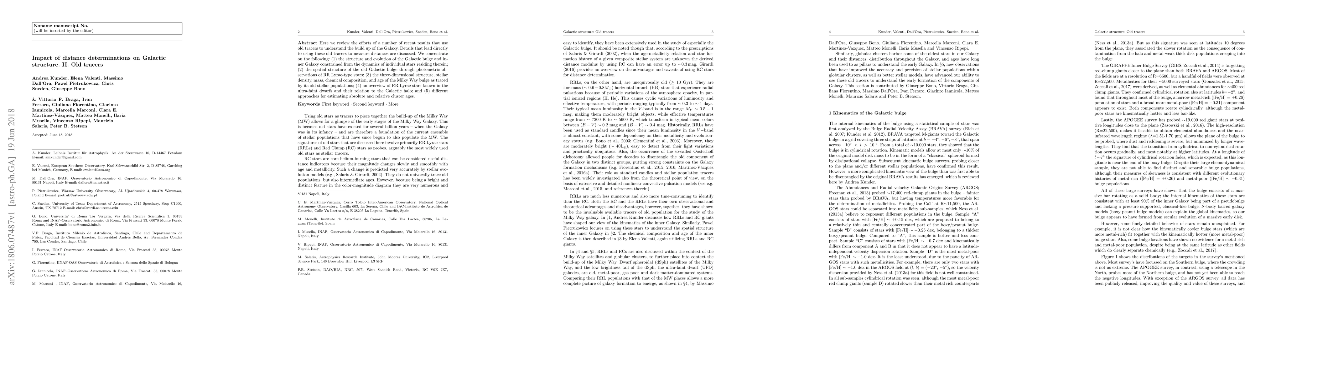 Here we review the efforts of a number of recent results that use old tracers to understand the build up of the Galaxy. Details that lead directly to using these old tracers to measure distances are discussed. We concentrate on the following: (1) the structure and evolution of the Galactic bulge and inner Galaxy constrained from the dynamics of individual stars residing therein; (2) the spatial structure of the old Galactic bulge through photometric observations of RR Lyrae-type stars; (3) the three\--dimensional structure, stellar density, mass, chemical composition, and age of the Milky Way bulge as traced by its old stellar populations; (4) an overview of RR Lyrae stars known in the ultra-faint dwarfs and their relation to the Galactic halo; and (5) different approaches for estimating absolute and relative cluster ages.