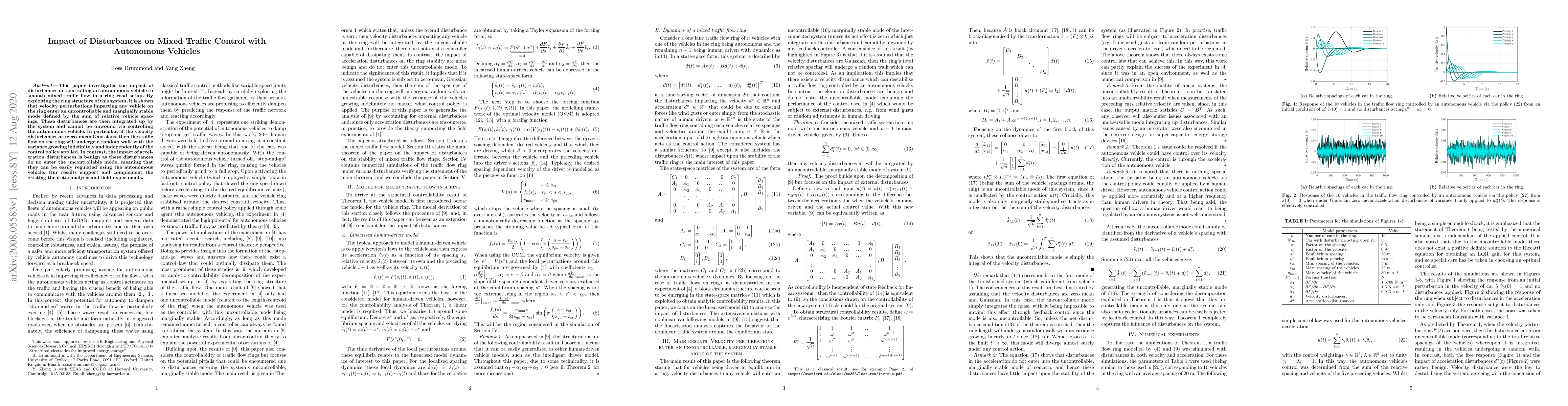 This paper investigates the impact of disturbances on controlling an autonomous vehicle to smooth mixed traffic flow in a ring road setup. By exploiting the ring structure of this system, it is shown that velocity perturbations impacting any vehicle on the ring enter an uncontrollable and marginally stable mode defined by the sum of relative vehicle spacings. These disturbances are then integrated up by the system and cannot be unwound via controlling the autonomous vehicle. In particular, if the velocity disturbances are zero-mean Gaussians, then the traffic flow on the ring will undergo a random walk with the variance growing indefinitely and independently of the control policy applied. In contrast, the impact of acceleration disturbances is benign as these disturbances do no enter the uncontrollable mode, meaning that they can be easily regulated using the autonomous vehicle. Our results support and complement the existing theoretic analysis and field experiments.