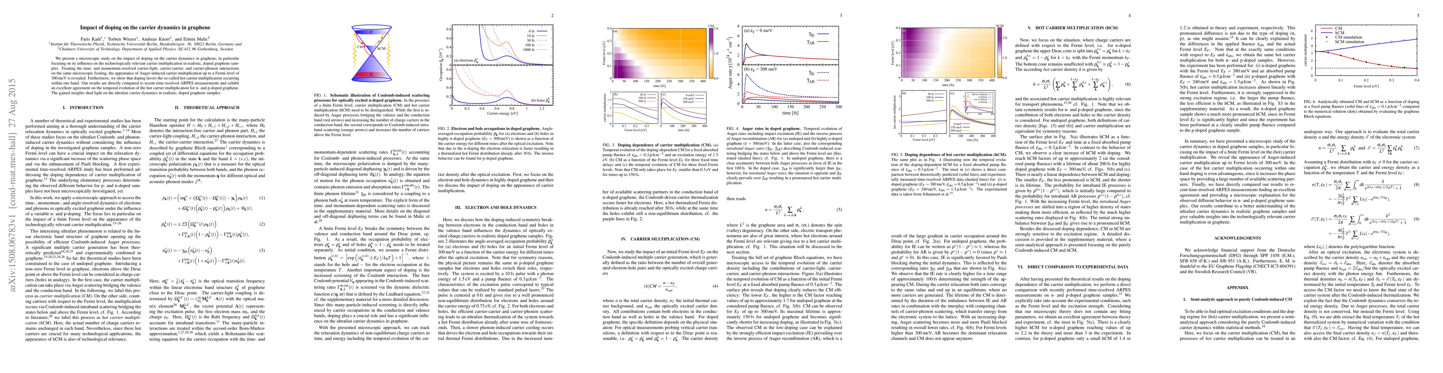 This study investigates how doping affects carrier dynamics in graphene, revealing Auger-induced carrier multiplication up to 300 meV and showing that doping promotes hot carrier multiplication within one band. Results align well with recent time-resolved ARPES measurements, providing insights into ultrafast carrier dynamics in doped graphene.