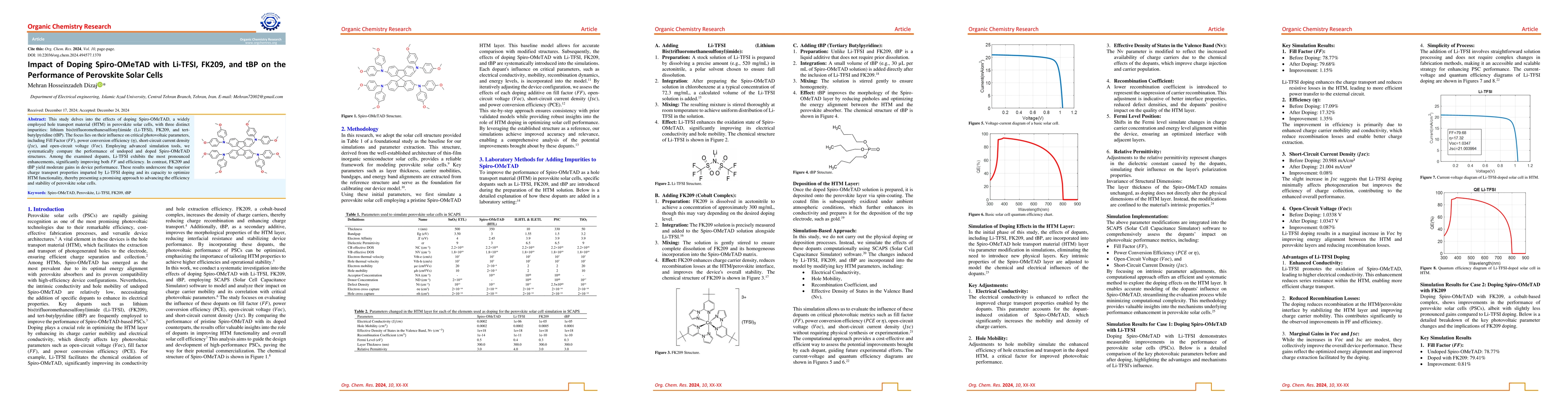 This study investigates the effects of doping Spiro-OMeTAD with Li-TFSI, FK209, and tBP on perovskite solar cell performance, finding Li-TFSI significantly boosts Fill Factor and efficiency, while FK209 and tBP offer moderate improvements.