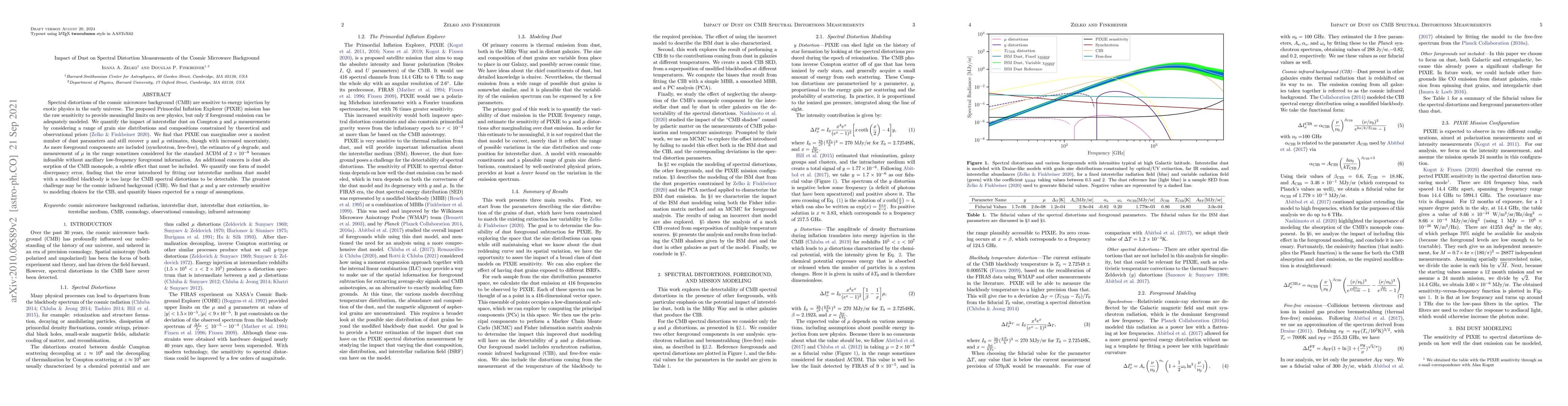 Spectral distortions of the cosmic microwave background (CMB) are sensitive to energy injection by exotic physics in the early universe. The proposed Primordial Inflation Explorer (PIXIE) mission has the raw sensitivity to provide meaningful limits on new physics, but only if foreground emission can be adequately modeled. We quantify the impact of interstellar dust on Compton $y$ and $\mu$ measurements by considering a range of grain size distributions and compositions constrained by theoretical and observational priors (Zelko & Finkbeiner 2020). We find that PIXIE can marginalize over a modest number of dust parameters and still recover $y$ and $\mu$ estimates, though with increased uncertainty. As more foreground components are included (synchrotron, free-free), the estimates of $y$ degrade, and measurement of $\mu$ in the range sometimes considered for the standard $\Lambda$CDM of $2\times10^{-8}$ becomes infeasible without ancillary low-frequency foreground information. An additional concern is dust absorption of the CMB monopole, a subtle effect that must be included. We quantify one form of model discrepancy error, finding that the error introduced by fitting our interstellar medium dust model with a modified blackbody is too large for CMB spectral distortions to be detectable. The greatest challenge may be the cosmic infrared background (CIB). We find that $\mu$ and $y$ are extremely sensitive to modeling choices for the CIB, and quantify biases expected for a range of assumptions.