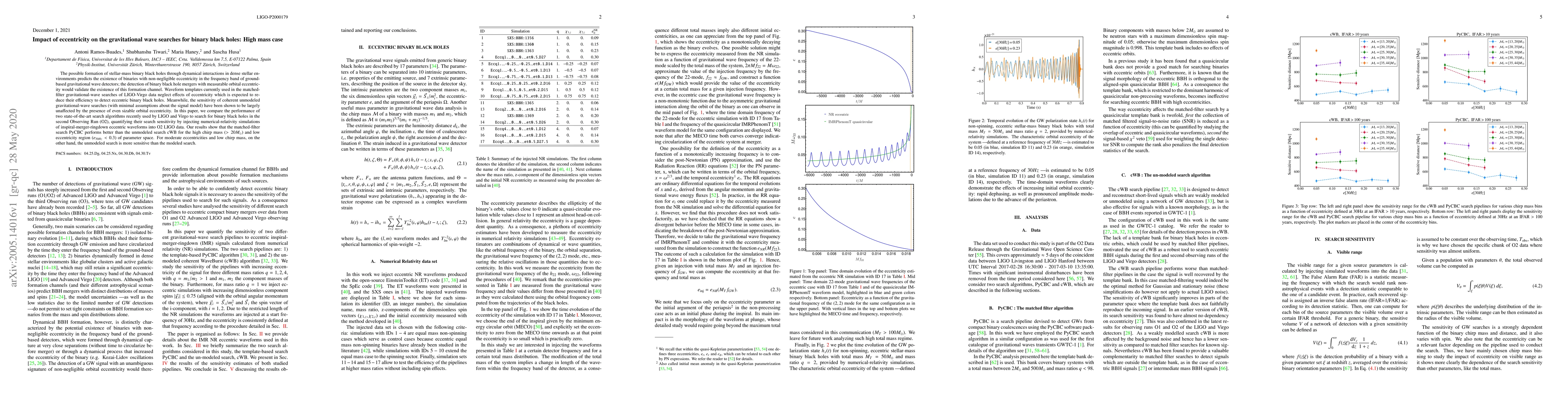 This paper investigates the impact of eccentricity on gravitational wave searches for high mass binary black holes, finding that state-of-the-art matched-filter searches like PyCBC are more efficient than unmodeled searches like cWB for high chirp masses and low eccentricities. Conversely, unmodeled searches outperform matched-filter searches for moderate eccentricities and lower chirp masses.