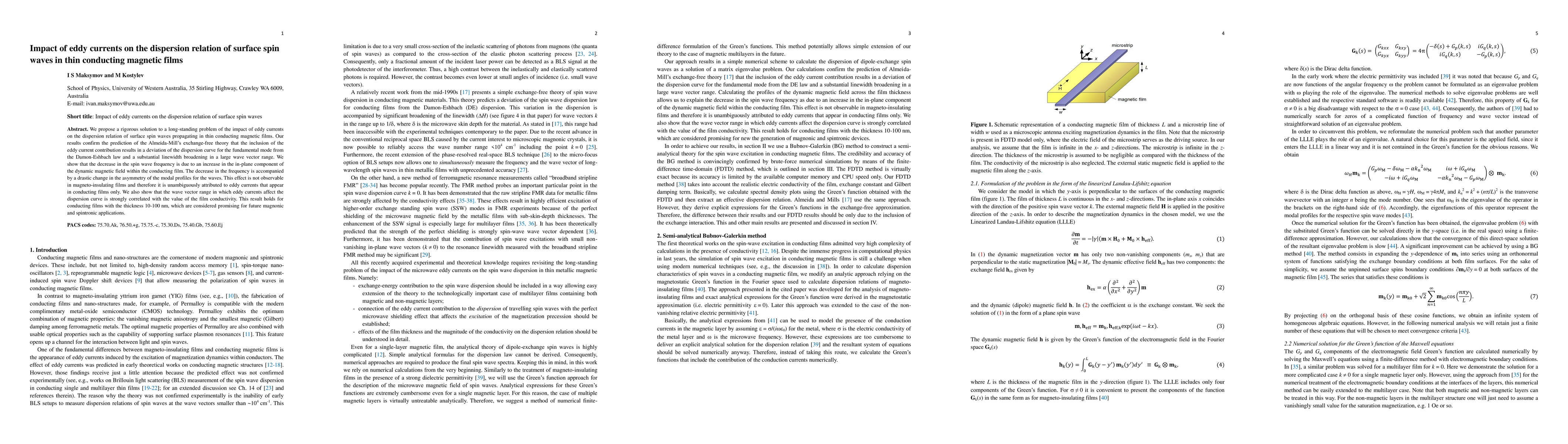 This paper rigorously addresses the impact of eddy currents on the dispersion relation of surface spin waves in thin conducting magnetic films, confirming that eddy currents cause a deviation from the Damon-Eshbach law and significant linewidth broadening, with effects strongly correlated to film conductivity.