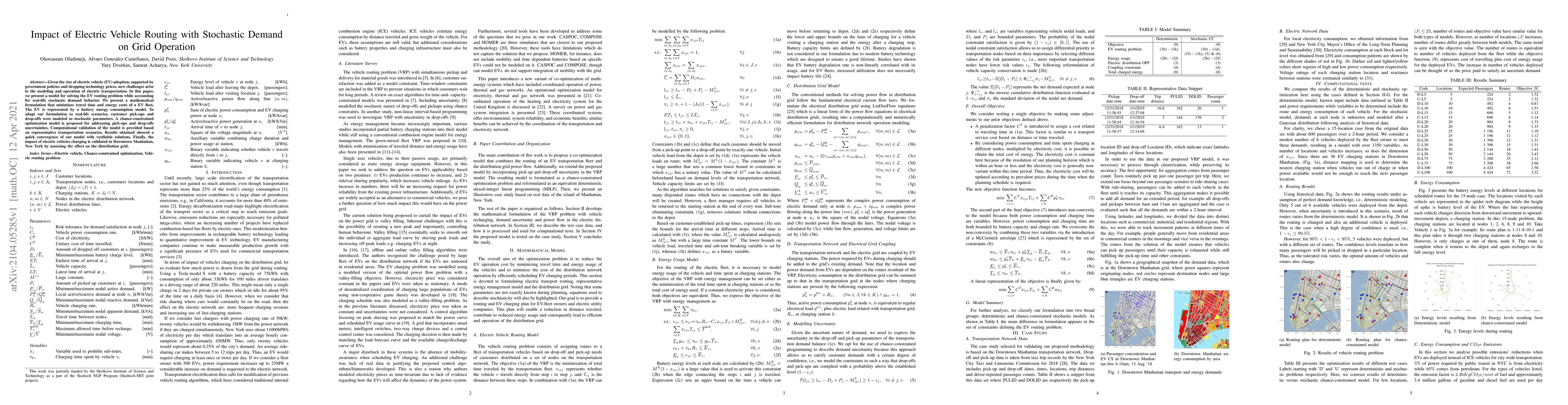 Given the rise of electric vehicle (EV) adoption, supported by government policies and dropping technology prices, new challenges arise in the modeling and operation of electric transportation. In this paper, we present a model for solving the EV routing problem while accounting for real-life stochastic demand behavior. We present a mathematical formulation that minimizes travel time and energy costs of an EV fleet. The EV is represented by a battery energy consumption model. To adapt our formulation to real-life scenarios, customer pick-ups and drop-offs were modeled as stochastic parameters. A chance-constrained optimization model is proposed for addressing pick-ups and drop-offs uncertainties. Computational validation of the model is provided based on representative transportation scenarios. Results obtained showed a quick convergence of our model with verifiable solutions. Finally, the impact of electric vehicles charging is validated in Downtown Manhattan, New York by assessing the effect on the distribution grid.