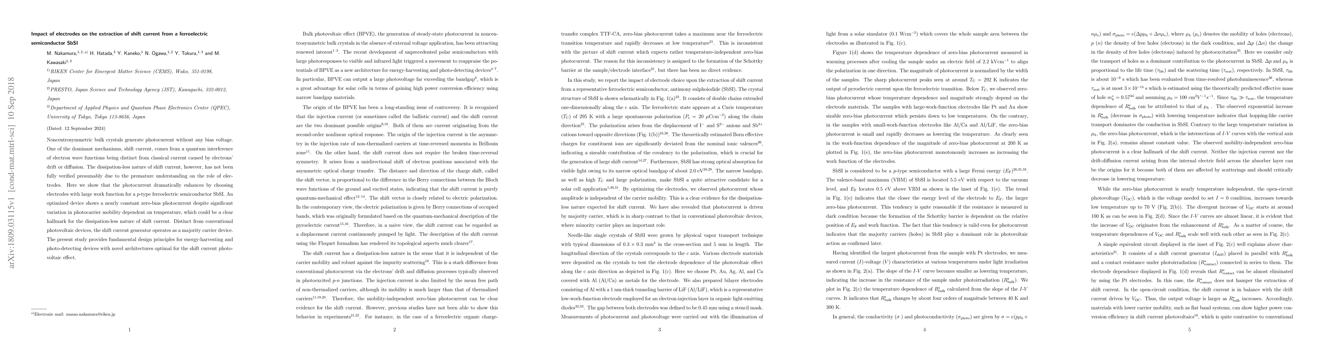 This paper investigates how electrode work function influences the extraction of shift current in a $p$-type ferroelectric semiconductor SbSI. The study finds that using electrodes with large work function significantly enhances the photocurrent, demonstrating a nearly constant zero-bias photocurrent, which suggests the dissipation-less nature of shift current.