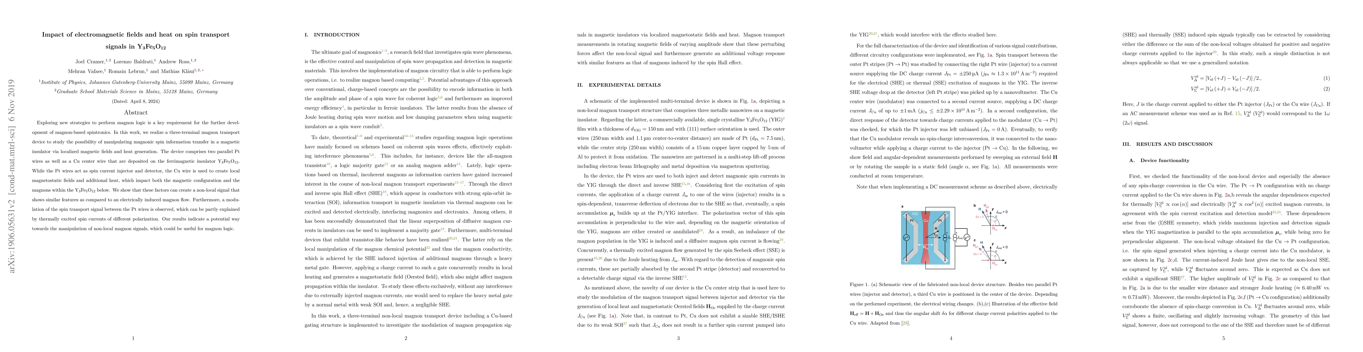 This paper investigates the impact of electromagnetic fields and heat on spin transport signals in Y$_{3}$Fe$_{5}$O$_{12}$, demonstrating a three-terminal device that manipulates magnonic spin information transfer. The results show a modulation of spin transport signals, suggesting potential for magnon logic applications.