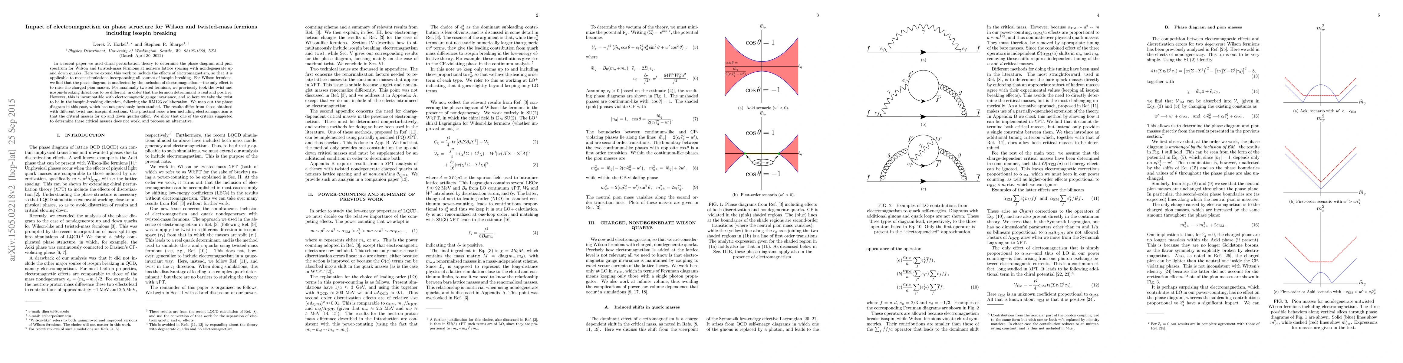 This paper extends previous work on the phase diagram and pion spectrum for Wilson and twisted-mass fermions to include electromagnetism, focusing on isospin breaking. For Wilson fermions, electromagnetism only raises charged pion masses, while for maximally twisted fermions, the twist direction is adjusted to align with electromagnetic gauge invariance, leading to a new phase diagram.