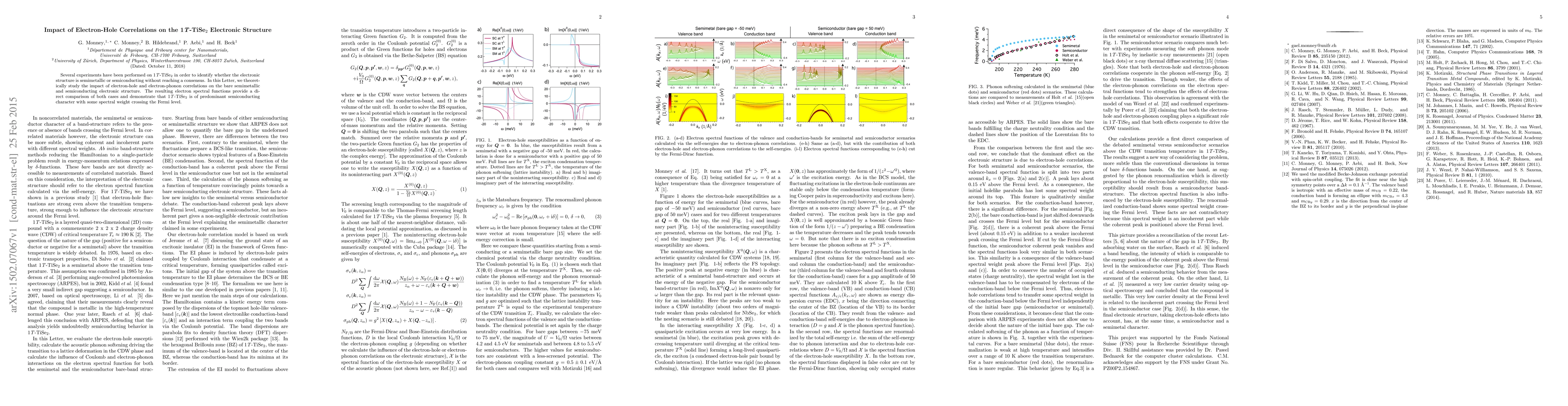 This research theoretically investigates electron-hole and electron-phonon correlations in 1T-TiSe2, revealing that while its electronic structure shows semiconducting traits, there is some spectral weight crossing the Fermi level, indicating a semimetallic component.