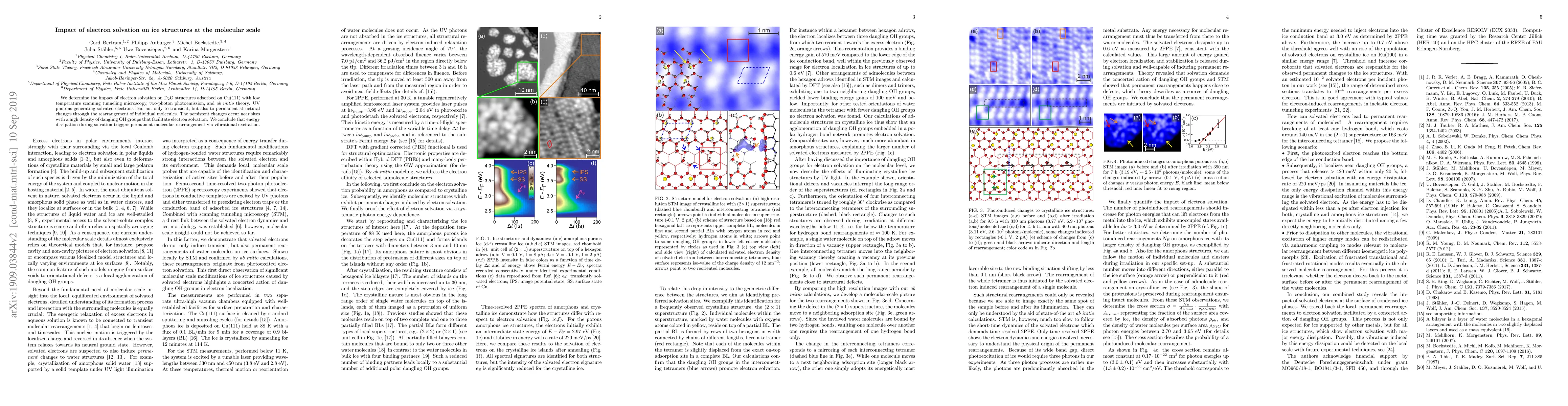 We determine the impact of electron solvation on D$_2$O structures adsorbed on Cu(111) with low temperature scanning tunneling microscopy, two-photon photoemission, and ab initio theory. UV photons generating solvated electrons lead not only to transient, but also to permanent structural changes through the rearrangement of individual molecules. The persistent changes occur near sites with a high density of dangling OH groups that facilitate electron solvation. We conclude that energy dissipation during solvation triggers permanent molecular rearrangement via vibrational excitation.