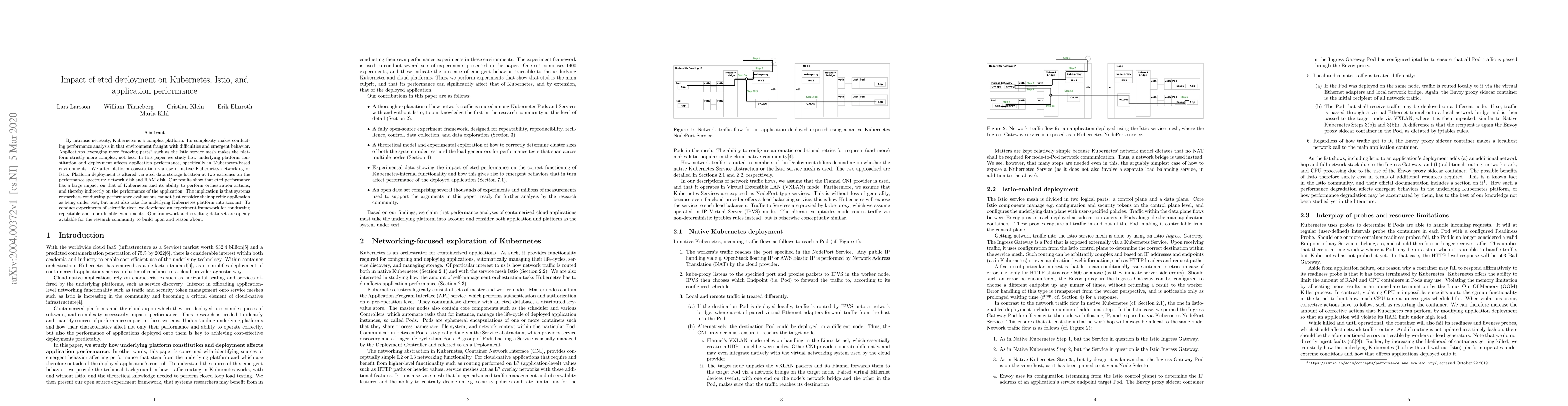 By intrinsic necessity, Kubernetes is a complex platform. Its complexity makes conducting performance analysis in that environment fraught with difficulties and emergent behavior. Applications leveraging more "moving parts" such as the Istio service mesh makes the platform strictly more complex, not less. In this paper we study how underlying platform constitution and deployment affects application performance, specifically in Kubernetes-based environments. We alter platform constitution via use of native Kubernetes networking or Istio. Platform deployment is altered via etcd data storage location at two extremes on the performance spectrum: network disk and RAM disk. Our results show that etcd performance has a large impact on that of Kubernetes and its ability to perform orchestration actions, and thereby indirectly on the performance of the application. The implication is that systems researchers conducting performance evaluations cannot just consider their specific application as being under test, but must also take the underlying Kubernetes platform into account. To conduct experiments of scientific rigor, we developed an experiment framework for conducting repeatable and reproducible experiments. Our framework and resulting data set are openly available for the research community to build upon and reason about.