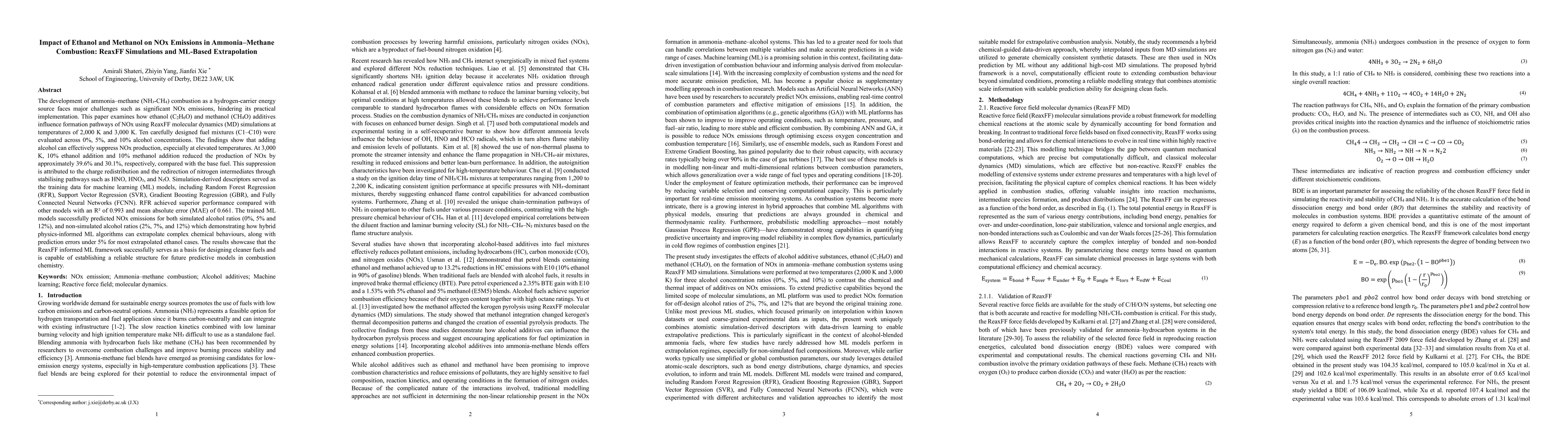 This study utilizes ReaxFF molecular dynamics simulations combined with machine learning (ML) models, specifically Random Forest Regression (RFR), to analyze the impact of ethanol and methanol additives on NOx emissions in ammonia-methane combustion.