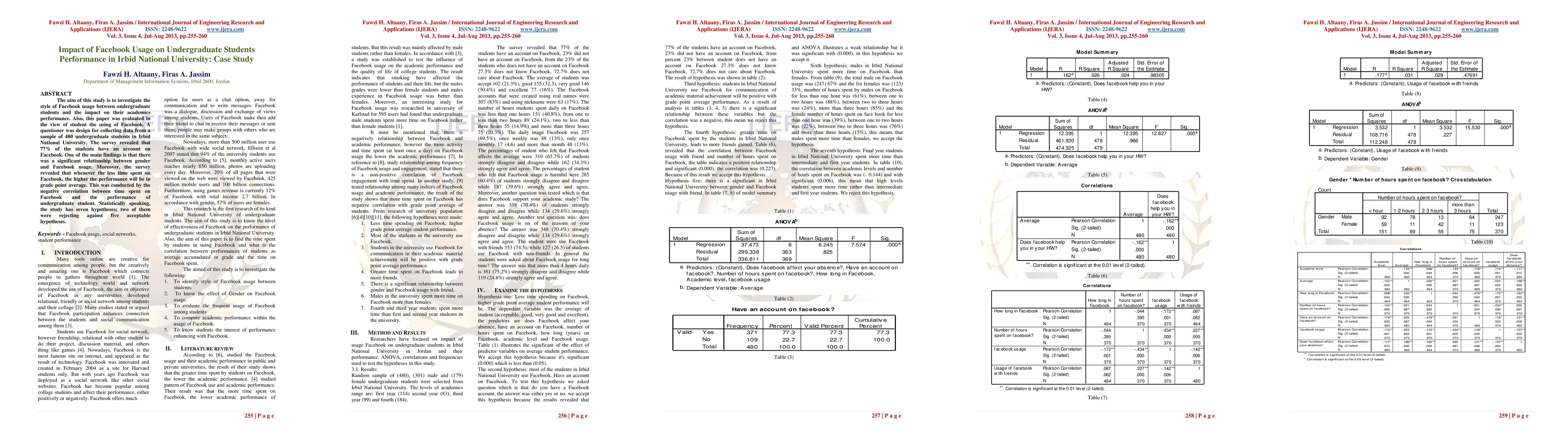 This study examines the relationship between Facebook usage and academic performance among undergraduate students at Irbid National University, finding a significant negative correlation between time spent on Facebook and GPA. The survey revealed that 77% of students use Facebook, with gender influencing usage patterns, and most hypotheses supported the notion that less Facebook time correlates with better academic performance.