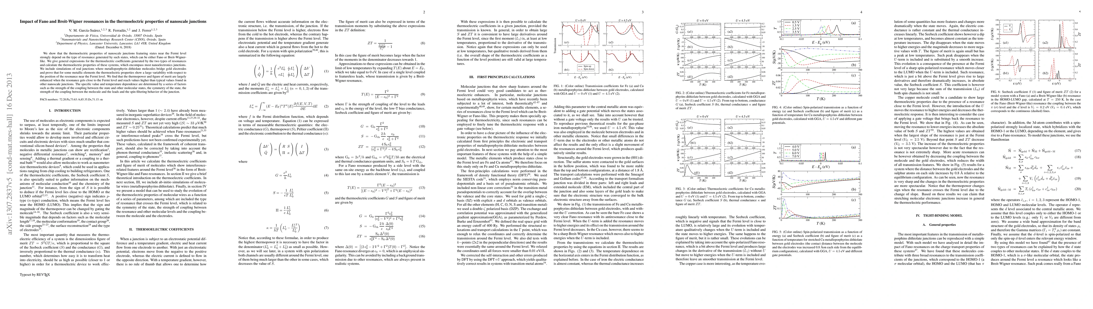 We show that the thermoelectric properties of nanoscale junctions featuring states near the Fermi level strongly depend on the type of resonance generated by such states, which can be either Fano or Breit-Wigner-like. We give general expressions for the thermoelectric coefficients generated by the two types of resonances and calculate the thermoelectric properties of these systems, which encompass most nanoelectronics junctions. We include simulations of real junctions where metalloporphyrin molecules bridge gold electrodes and prove that for some metallic elements the thermoelectric properties show a large variability. We find that the thermopower and figure of merit are largely enhanced when the resonance gets close to the Fermi level and reach values much higher than typical values found in other nanoscale junctions. The specific value and temperature dependence are determined by a series of factors such as the strength of the coupling between the state and other molecular states, the symmetry of the state, the strength of the coupling between the molecule and the leads and the spin filtering behavior of the junction.