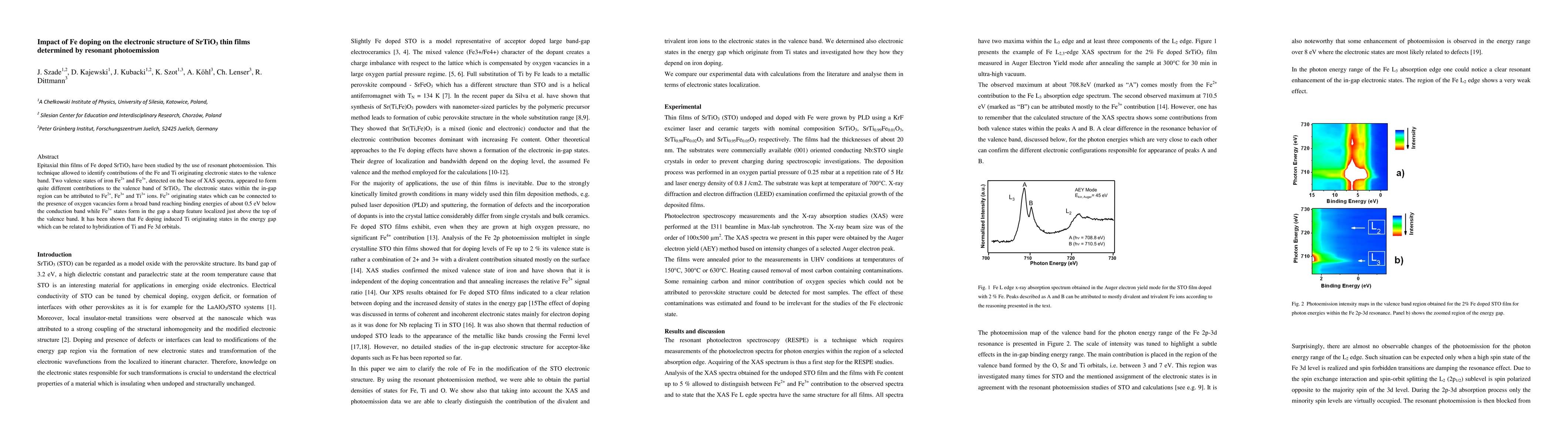 Fe doping in SrTiO3 thin films alters their electronic structure, as revealed by resonant photoemission. The study identifies distinct contributions from Fe2+ and Fe3+ states to the valence band, with Fe2+ linked to oxygen vacancies forming a broad band near the conduction band, while Fe3+ creates a sharp feature in the gap.