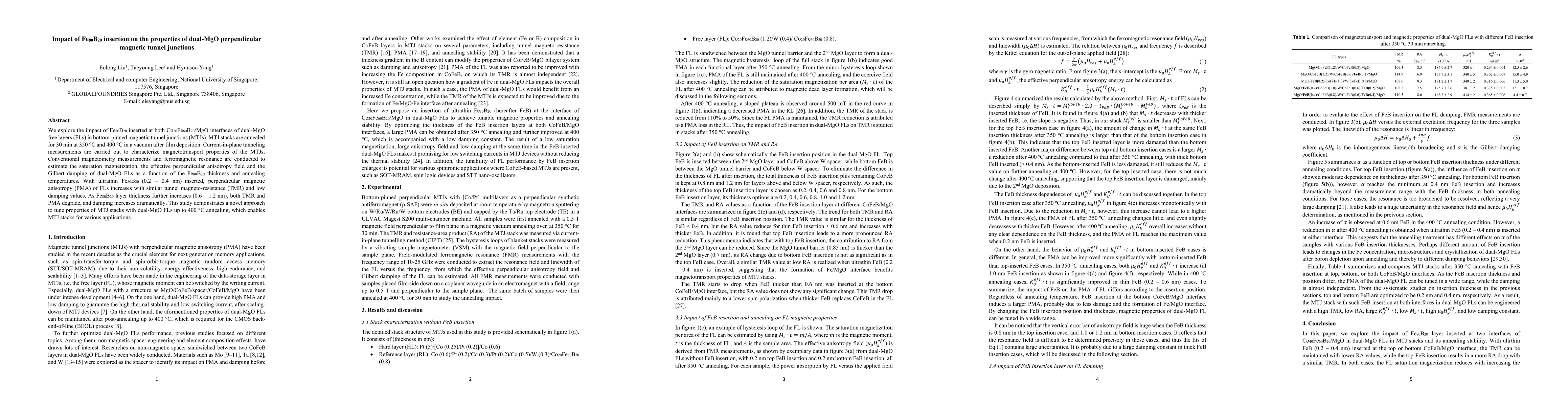 This study investigates the effect of Fe$_{80}$B$_{20}$ insertion at both Co$_{20}$Fe$_{80}$B$_{20}$/MgO interfaces in dual-MgO free layers of magnetic tunnel junctions (MTJs). The optimal Fe$_{80}$B$_{20}$ thickness (0.2 - 0.4 nm) enhances perpendicular magnetic anisotropy and maintains low damping, while thicker layers (0.6 - 1.2 nm) degrade these properties.