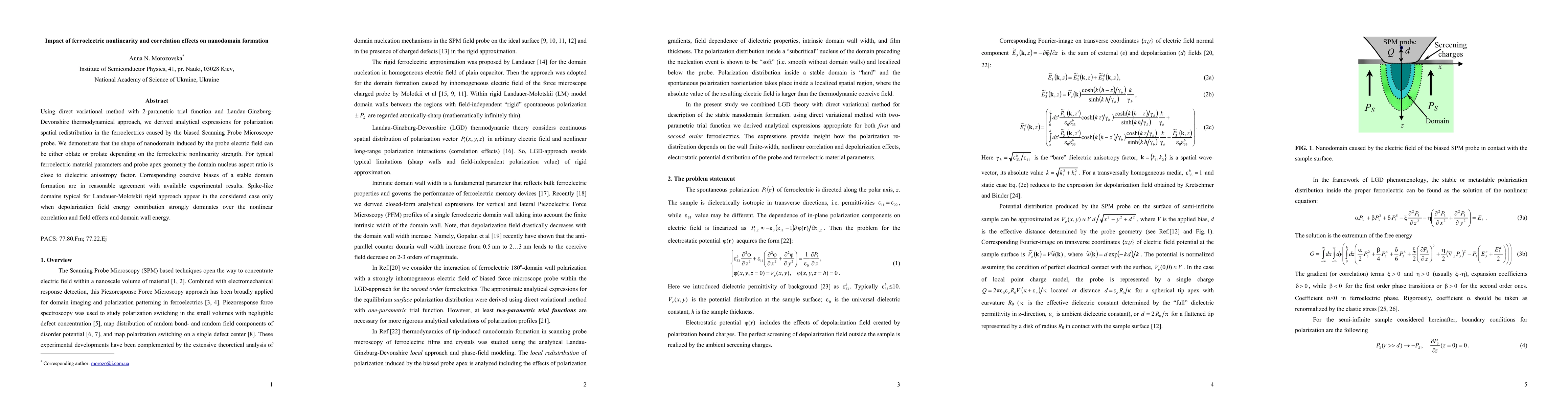 Using direct variational method with 2-parametric trial function and Landau-Ginzburg-Devonshire thermodynamical approach, we derived analytical expressions for polarization spatial redistribution in the ferroelectrics caused by the biased Scanning Probe Microscope probe. We demonstrate that the shape of nanodomain induced by the probe electric field can be either oblate or prolate depending on the ferroelectric nonlinearity strength. For typical ferroelectric material parameters and probe apex geometry the domain nucleus aspect ratio is close to dielectric anisotropy factor. Corresponding coercive biases of a stable domain formation are in reasonable agreement with available experimental results. Spike-like domains typical for Landauer-Molotskii rigid approach appear in the considered case only when depolarization field energy contribution strongly dominates over the nonlinear correlation and field effects and domain wall energy.
