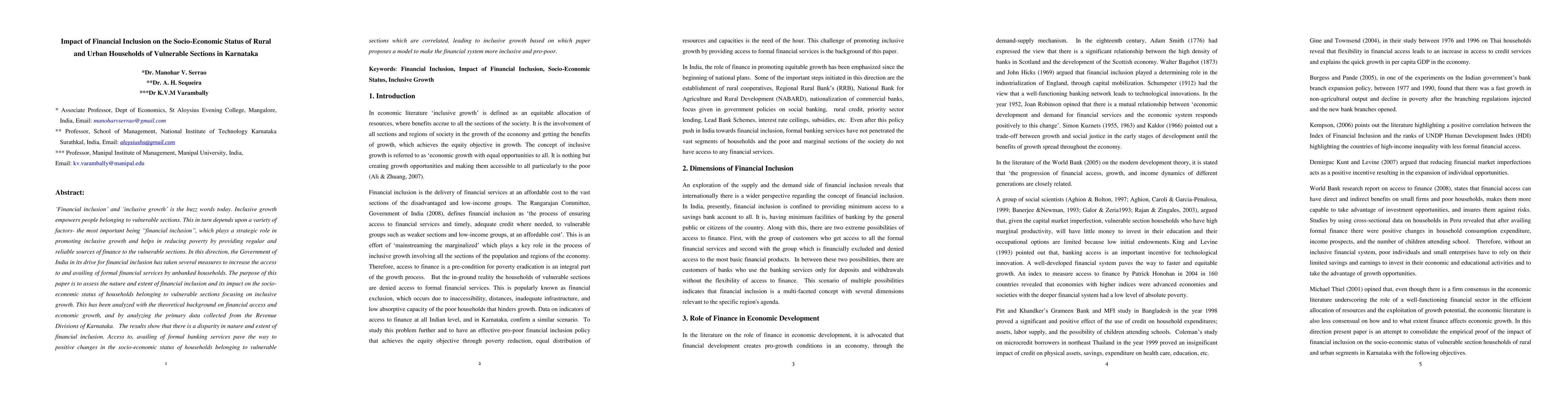 This paper assesses the impact of financial inclusion on the socio-economic status of vulnerable rural and urban households in Karnataka, finding that access to formal banking services correlates with positive socio-economic changes, thereby promoting inclusive growth. The study proposes a model to enhance financial inclusion for pro-poor development.