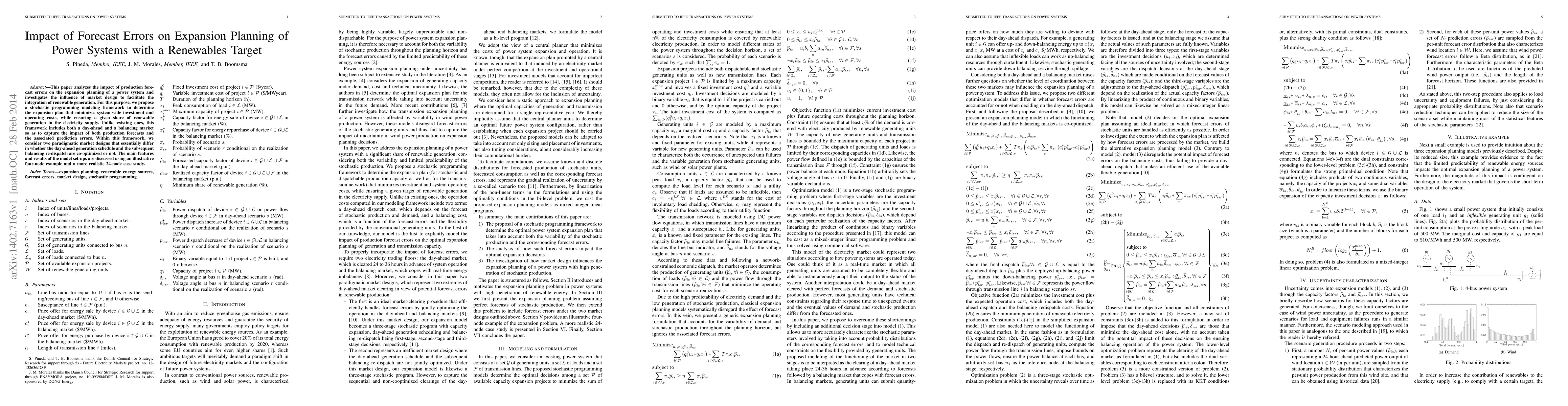This paper proposes a stochastic programming framework to optimize power system expansion planning under renewable integration, considering forecast errors and market designs. It evaluates two market designs, comparing their impacts on investment and operating costs using both a small and a large case study.