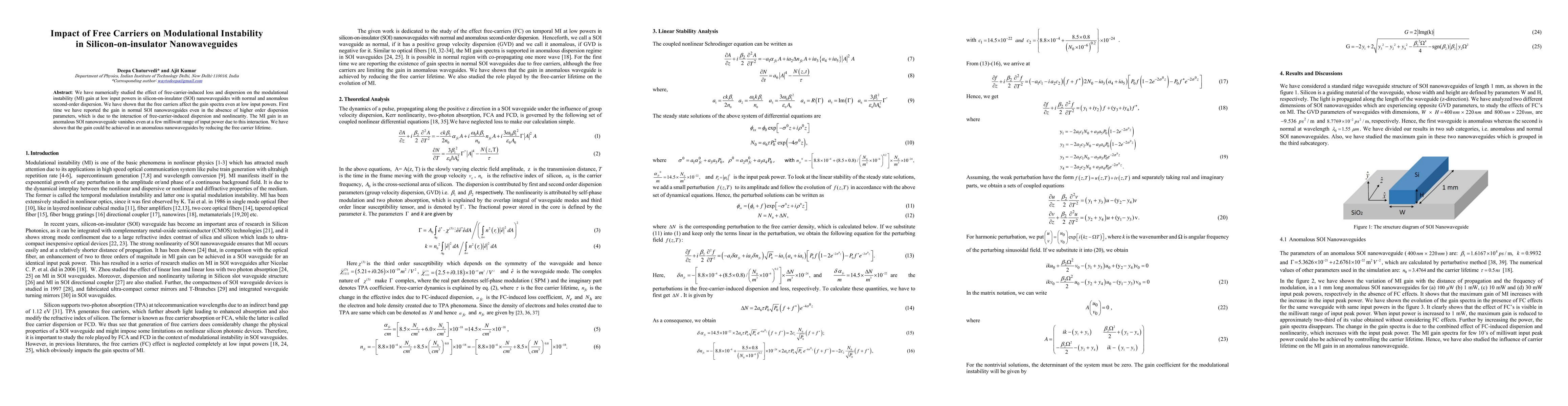 This study numerically investigates how free carriers influence modulational instability gain in silicon-on-insulator nanowaveguides, revealing that they affect gain spectra even at low input powers. The research finds that free carriers can induce gain in normal dispersion nanowaveguides even without higher-order dispersion, while anomalous dispersion nanowaveguides lose gain at low power due to carrier interactions, though this can be mitigated by reducing free carrier lifetime.