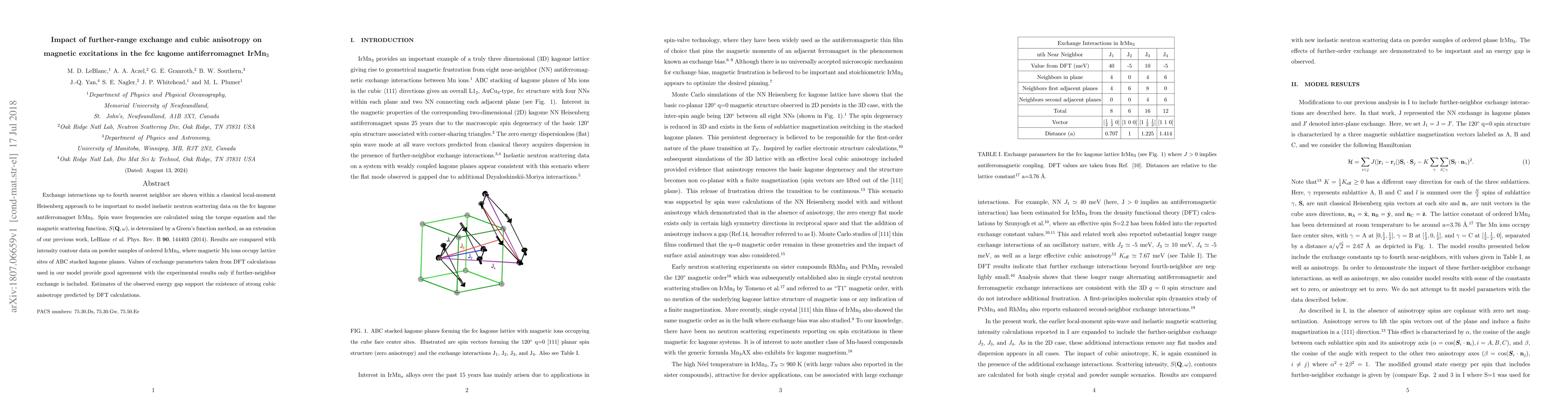 Exchange interactions up to fourth nearest neighbor are shown within a classical local-moment Heisenberg approach to be important to model inelastic neutron scattering data on the fcc kagome antiferromagnet IrMn$_3$. Spin wave frequencies are calculated using the torque equation and the magnetic scattering function, $S({\bf Q},\omega)$, is determined by a Green's function method, as an extension of our previous work, LeBlanc et al, Phys. Rev. B 90, 144403 (2014). Results are compared with intensity contour data on powder samples of ordered IrMn$_3$, where magnetic Mn ions occupy lattice sites of ABC stacked kagome planes. Values of exchange parameters taken from DFT calculations used in our model provide good agreement with the experimental results only if further-neighbor exchange is included. Estimates of the observed energy gap support the existence of strong cubic anisotropy predicted by DFT calculations.