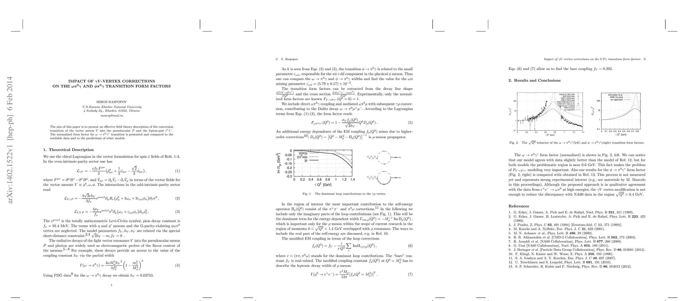 The aim of this paper is to present an effective field theory description of the conversion transition of the vector meson V into the pseudoscalar P and the lepton-pair l+l-. The normalized form factor for omega to pi^0 gamma^ast transition is presented and compared to the available data and to the predictions of other models.